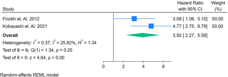 ![Forest plot showing hazard ratios with 95% confidence intervals for two studies: Finckh et al. 2012 (3.08 [1.06, 5.10]) and Kobayashi et al. 2021 (4.77 [2.75, 6.79]), each with a weight of 50%. Overall result: 3.92 [2.27, 5.58]. Heterogeneity statistics include τ²=0.37, I²=25.62%. Random-effects REML model is used. Horizontal axis ranges from 0 to 6.](https://www.frontiersin.org/files/Articles/1598590/fcvm-12-1598590-HTML-r1/image_m/fcvm-12-1598590-g011.jpg)