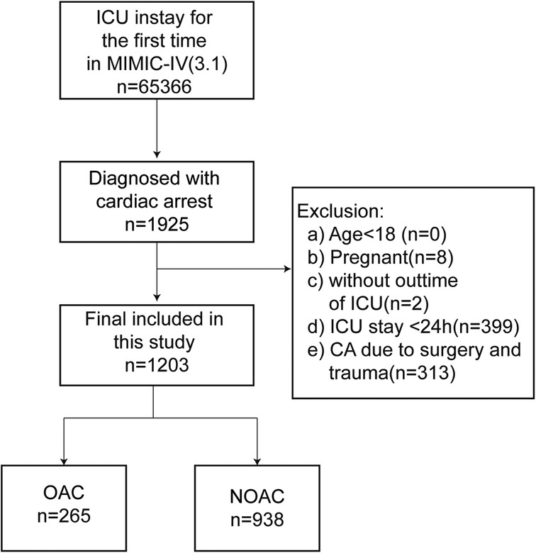 As shown in Figure 1, data were extracted from the MIMIC-IV database for 1,925 ICU-admitted patients who experienced CA during their first ICU stay. A total of 1,203 patients were ultimately included in the analysis after excluding individuals younger than 18, pregnant patients, those with ICU stays of less than 24 h, and cases where CA was due to surgical or traumatic causes.