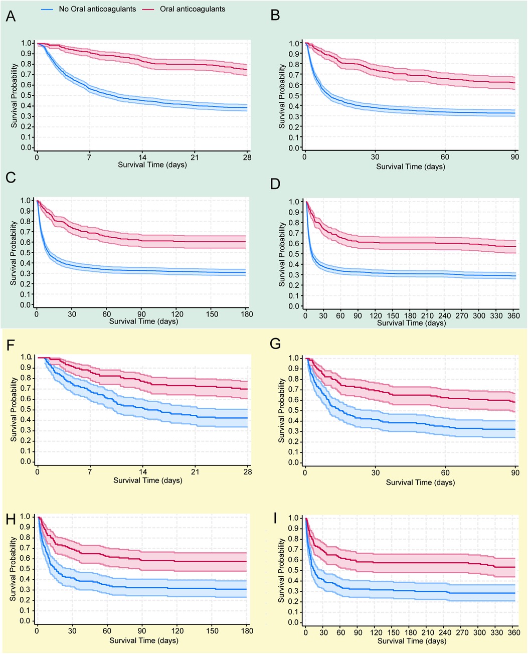 Survival probability graphs show the impact of oral anticoagulants over different periods. Panels A to D and F to I depict survival probabilities over time, comparing with and without oral anticoagulants. Blue lines represent no anticoagulants, and red lines represent anticoagulants. Timeframes vary across the panels, ranging from 28 days to 360 days, illustrating higher survival probabilities with anticoagulant use in each graph.