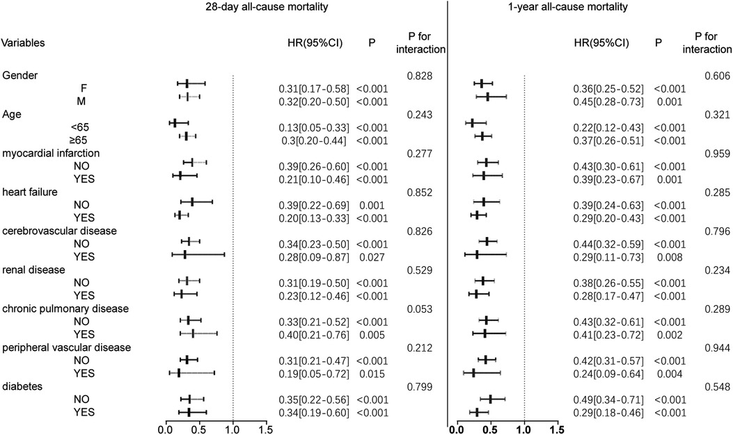 Forest plot showing hazard ratios and confidence intervals for 28-day and 1-year all-cause mortality across various variables. Variables include gender, age, myocardial infarction, heart failure, cerebrovascular disease, renal disease, chronic pulmonary disease, peripheral vascular disease, and diabetes. Hazard ratios are accompanied by P-values, indicating statistical significance, and P-values for interaction are listed. The plot provides a comparative analysis of factors affecting mortality over these two time frames.