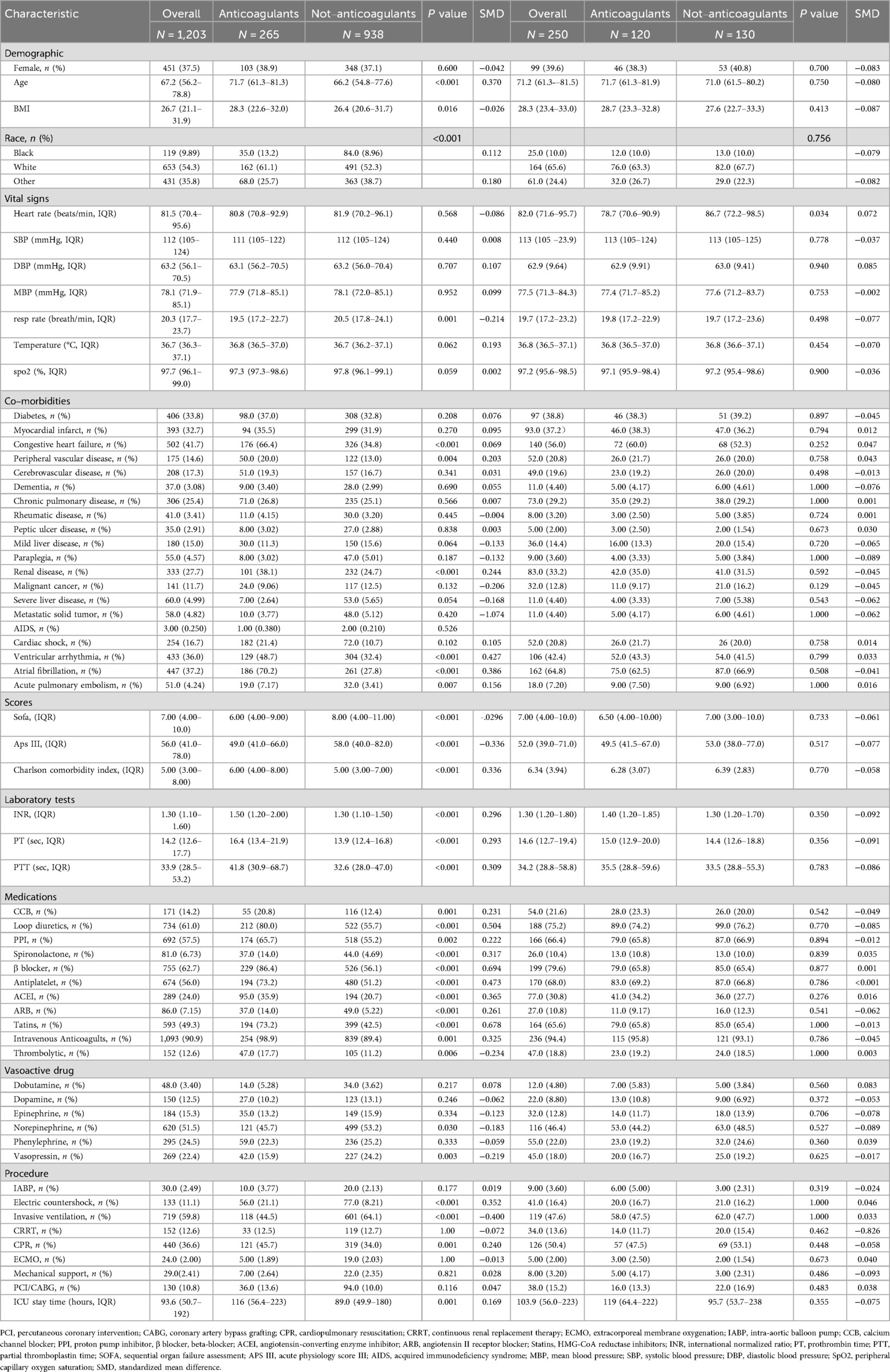 Before PSM, 265 patients treated with oral anticoagulants were classified into the oral anticoagulant group, while 938 patients without anticoagulant treatment were assigned to the non-oral anticoagulant group. The original cohort displayed a higher mean age, elevated mean BMI, and a higher prevalence of comorbidities, including heart failure, peripheral vascular disease, and chronic kidney disease. Additionally, the cohort had higher mean values for INR, PT, and PTT. Table 1 provides an overview of baseline characteristic differences between the oral anticoagulant group and the non-oral anticoagulant group.