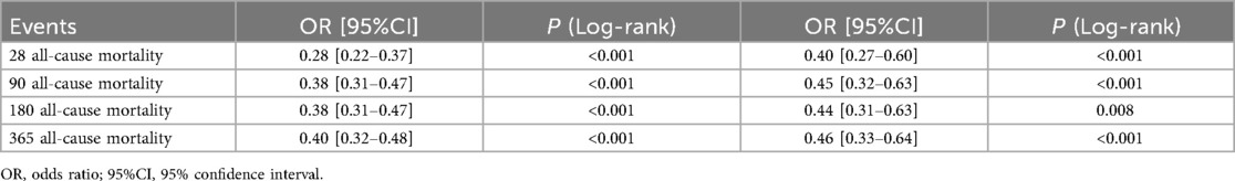 The primary outcomes of the present study were 28-day and 365-day all-cause mortality. The secondary outcomes were 90-day and 180-day all-cause mortality.
