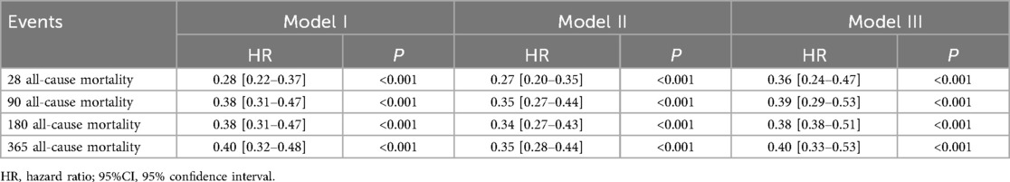 As shown in Supplementary Table S1, Model III demonstrated the best fit for the 28-day, 90-day, 180-day, and 365 day mortality analyses, with the lowest AIC (Akaike Information Criterion) and BIC (Bayesian Information Criterion) values across these time points (Supplementary Table S1). Additionally, following PSM, the oral anticoagulant group exhibited a significant reduction in all-cause mortality. Specifically, there was a 60% reduction in the risk of death at 28 days, 55% at 90 days, 56% at 180 days, and 54% at 365 days.