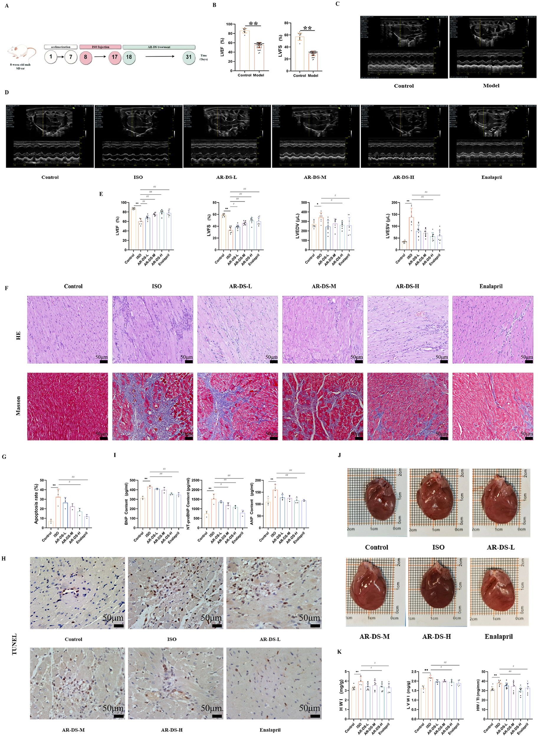 Specific experimental design and implementation (A) ultrasound detection results of rats after 10 days of intervention by ISO, 10 rats in the control group, and n = 44 rats in the model group (B,C). Ultrasonography results after intervention with drugs in each group of rats (D,E). Comparison with Control group: **P < 0.01, *P < 0.05; Comparison with ISO group: ##P < 0.01, #P < 0.05, 8–10 rats in each group. HE and Masson staining of rat myocardium in each group (40×, scale bar = 50 μm). (F) Myocardial apoptosis rate statistics (G) and TUNEL staining (40×, scale bar = 50 μm) of rats in each group (H) Serum BNP, NT-pro BNP, and ANP levels in rats in each group (I). Effects of rat heart and heart mass-related indices in each group of rats (J,K). Comparison with Control group: **P < 0.01, Comparison with ISO group: ##P < 0.01, #P < 0.05, n = 3.