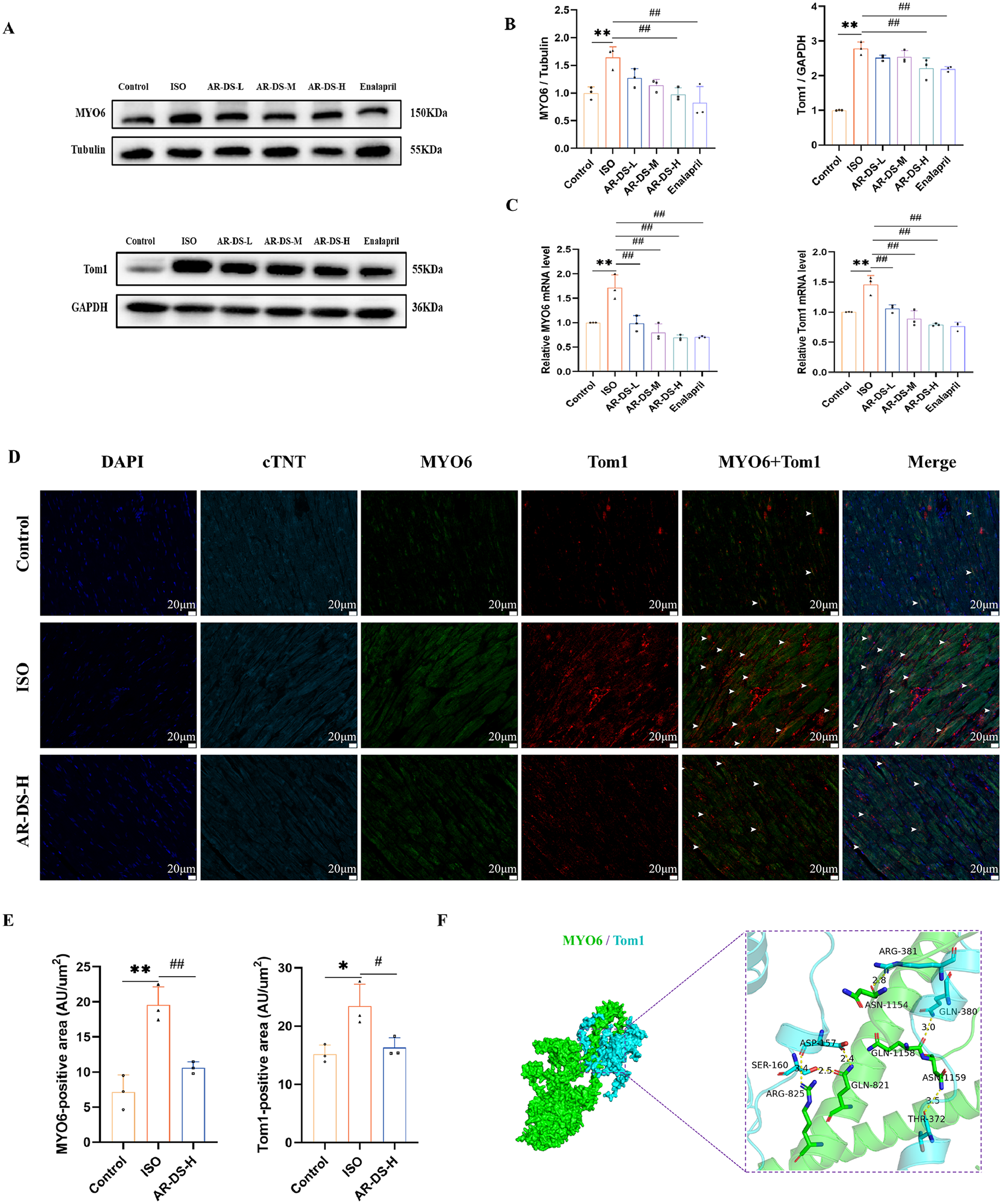 Relative protein expression and statistics of MYO6 and Tom1 in rat myocardium in each group (A,B). Relative gene expression and statistics of MYO6 and Tom1 in rat myocardium in each group (C) Multiple immunofluorescence staining images of rat myocardium in the Control, ISO, and AR-DS-H groups. MYO6 and Tom1 co-expressing cells were labeled using white arrows. (60×, scale bar = 20 μm) (D) Analysis of the average fluorescence intensity of MYO6 and Tom1 in the myocardium of rats from the Control, ISO, and AR-DS-H groups (E) Compared to the Control group: **P < 0.01, *P < 0.05; compared to the ISO group: ##P < 0.01, #P < 0.05, n = 3. Protein docking image of MYO6 and Tom1, where green represents the MYO6 protein and sky blue represents the Tom1 protein (F)