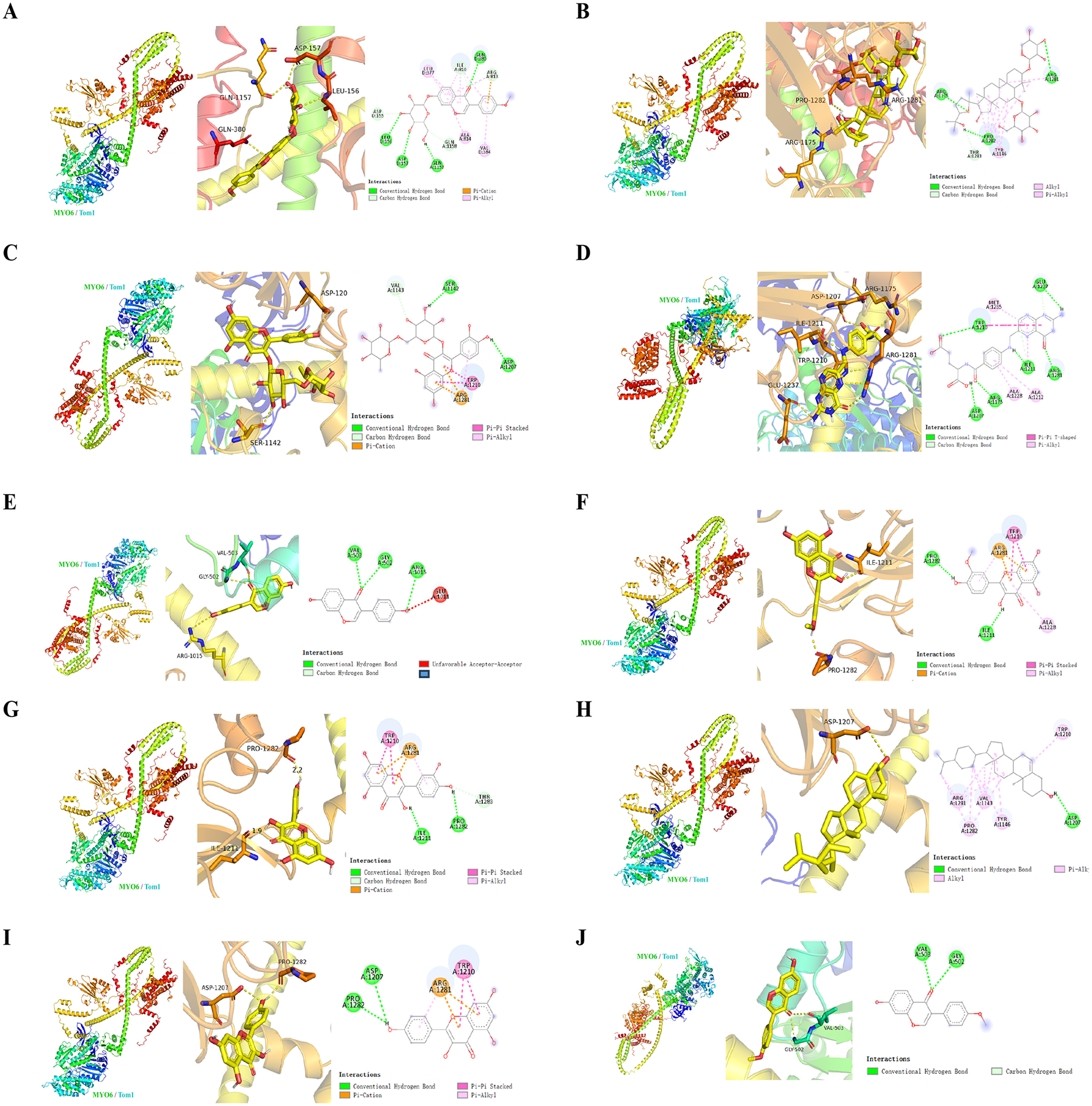 Molecular docking experiments of MYO6-Tom1 protein complex with AR-DS major components: Small molecule design and processing: Download the 3D structure in SDF format from PubChem data according to the CAS number of the small molecule, import the structure into ChemBio3D Ultra 14.0 for energy minimization, set the Minimum RMS Gradient to 0.001, and save the small molecule in mol2 format. The optimized small molecules were imported into AutodockTools-1.5.6 for hydrogenation, charge calculation, charge assignment, and setting of rotatable keys, and then saved as “pdbqt” format. Preparation and processing of protein: Use PyMOL 2.3.0 to remove protein water of crystallization, original ligand, etc. Import protein structure into AutoDocktools (v1.5.6) for hydrogenation, charge calculation, charge assignment, atom type assignment, and save it in “pdbqt” format. Preparation of parameter files: protein binding sites were predicted using POCASA 1.1, docking was performed using AutoDock Vina 1.1.2, and protein-related parameters were set to: center_x = 20.7, center_y = 13.9, center_z = −33.1; search space: size_x:60, size_y: 60. size_z:60 (each grid point is spaced at 0.375 Å), exhaustiveness: 10, and the rest of the parameters are set by default. The results were analyzed for interaction patterns using PyMOL 2.3.0 for the docking results.