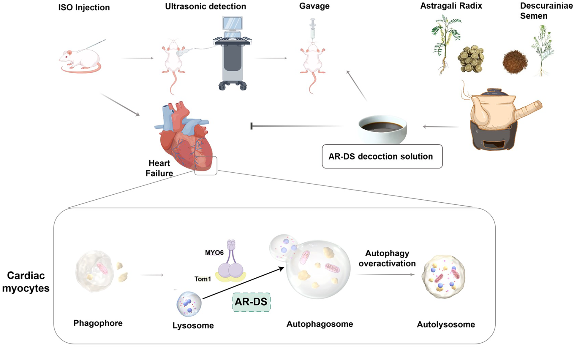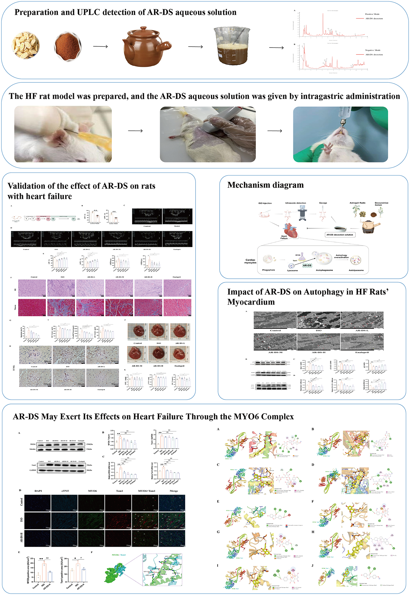 A rat model of heart failure was established and treated with various dosages of AR-DS decoction. Cardiac function was assessed using echocardiography, and cardiac-related mass indices were calculated. Histopathological changes were observed through HE and Masson staining. Serum levels of BNP, NT-pro BNP, and ANP were measured to evaluate AR-DS's efficacy. Electron microscopy was employed to examine the ultrastructure of cardiomyocytes, and TUNEL staining was used to assess apoptosis. Expression levels of LC3, Beclin1, p62, Myosin VI (MYO6), and Target of Myb1 (Tom1) in myocardial tissue were analyzed using qRT-PCR and Western Blot. The expression of MYO6 and Tom1 in myocardial tissue was observed through multiple immunofluorescent stainings. Protein docking was used to assess the binding energy between MYO6 and Tom1. Molecular docking to detect the binding energy and binding site of the MYO6-Tom1 complex to the major components of AR-DS.