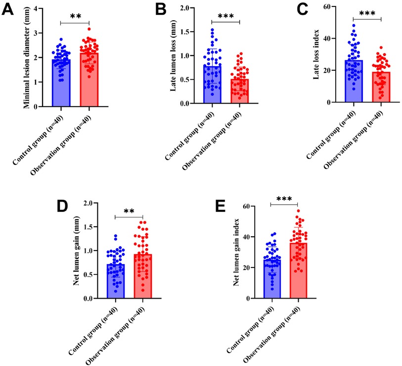 We compared the coronary restenosis in two groups of patients, and the results showed that after 6 months of treatment, 10 cases of restenosis occurred in the control group and 3 cases of restenosis occurred in the observation group, and the rate of restenosis in the observation group (7.50%) was significantly lower than that in the control group (25.00%), and the difference was statistically significant (χ² = 4.501, P = 0.034). In addition, compared with the control group, MLD, NG, and NGI were significantly larger, and LLL and LLI were significantly lower in the observation group (all P's < 0.05), as shown in Figure 1.