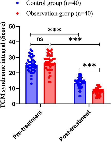 We compared the TCM syndrome scores of the two groups of patients, and the results showed that before treatment, the TCM syndrome score of the control group was 25.25 ± 4.88, while that of the observation group was 26.53 ± 5.32; the difference between the two groups was not statistically significant (P = 0.268). After treatment, the TCM syndrome score of the control group was 13.58 ± 3.47, while that of the observation group was 8.23 ± 2.17; both groups showed significantly lower TCM syndrome scores than those before the treatment (both P < 0.001), and the post-treatment TCM syndrome scores of the observation group were significantly lower than those of the control group (all P’s < 0.001), as shown in Figure 2.