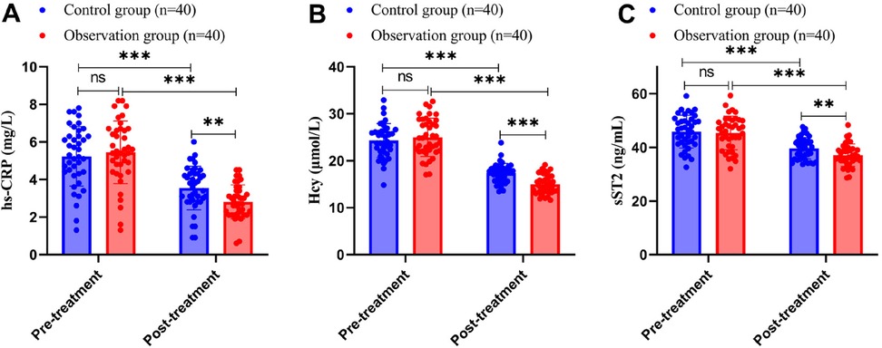 Previous studies have reported that elevated levels of hs-CRP and Hcy are associated with a higher risk of ISR after PCI in patients with coronary artery disease (31–33). In addition, elevated levels of sST2 are strongly associated with adverse cardiovascular outcomes after PCI (34). Therefore, we determined serum levels of hs-CRP, Hcy, and sST2 by ELISA, and the results showed no statistically significant differences in the levels of hs-CRP, Hcy, and sST2 between the two groups of patients before treatment (all P’s > 0.05). After treatment, the serum hs-CRP level in the control group was 3.55 ± 1.17 mg/L, the Hcy level was 17.41 ± 2.01 μmol/L, and the sST2 level was 39.67 ± 3.98 ng/mL; in contrast, the serum hs-CRP level in the observation group was 2.81 ± 0.90 mg/L, the Hcy level was 15.03 ± 2.07 μmol/L, and the sST2 level was 37.10 ± 4.19 ng/mL. These results indicate that hs-CRP, Hcy, and sST2 levels were significantly reduced in both groups after treatment (all P’s < 0.001), with the reductions in the observation group being significantly lower than those in the control group after treatment (all P’s < 0.01), as shown in Figure 3. Additional atherosclerosis-specific markers, including ox-LDL and Lp-PLA2, were also measured, showing consistent intergroup differences (Supplementary Table S1).