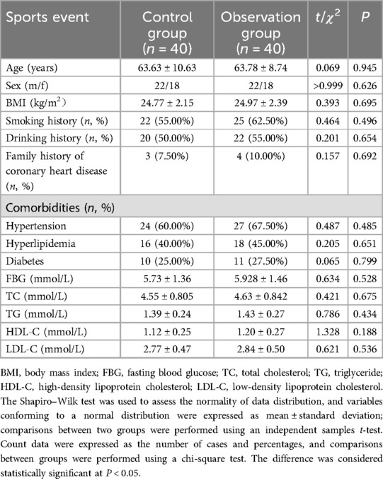 Eighty patients with coronary artery disease who underwent PCI at our hospital from August 2019 to February 2021 were enrolled in this study. Patients were assigned to either the control group (n = 40) or the observation group (n = 40) according to the method of a randomized numerical table. The control group received conventional medicine treatment, while the observation group was given YHTD alongside conventional medicine. There were no significant differences between the two groups in terms of age, gender, BMI, smoking history, drinking history, family history of coronary heart disease, comorbidities (hypertension, hyperlipidemia, diabetes mellitus), FBG, TG, TC, HDL-C, and LDL-C, among others (all P’s > 0.05) (Table 1).