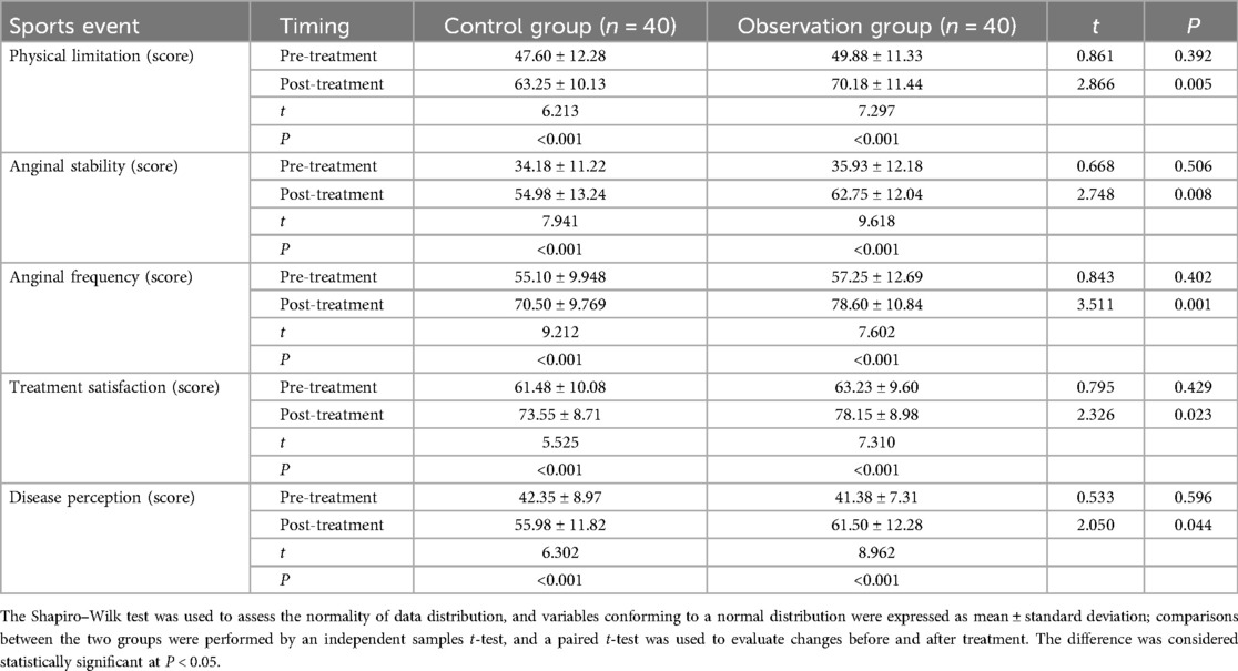 The SAQ was used to assess the CHD symptoms and their impact on daily life. It was found that there were no statistical differences between the two groups of patients across all SAQ dimensions before treatment (physical limitation, anginal stability, anginal frequency, treatment satisfaction, and disease perception) (all P’s > 0.05); after 6 months of treatment, SAQ scores of the patients in both groups were significantly higher than those before treatment (all P’s < 0.001). In addition, the post-treatment SAQ scores of the observation group were significantly higher than those of the control group (all P’s < 0.05) (Table 2).