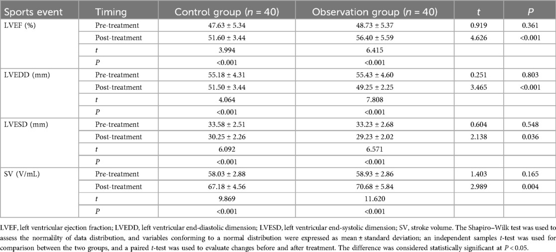 We compared LVEF, LVEDD, LVESD, and SV between the two groups. The results showed no statistical differences in LVEF, LVEDD, LVESD, and SV between the two groups before treatment (P > 0.05); after 6 months of treatment, LVEDD and LVESD were significantly reduced in both groups compared to pre-treatment values, and the reductions were were more pronounced in the observation group than in the control group (both P’s < 0.05). Additionally, LVEF and SV significantly increased in both groups after treatment, with the observation group showing greater improvements in LVEF and SV than the control group, and the differences were statistically significant (all P's < 0.05) (see Table 3).