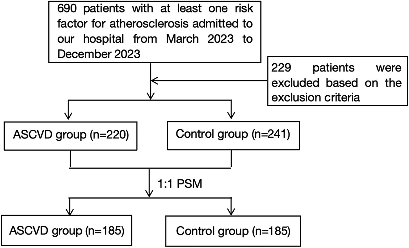 A total of 690 subjects had at least one risk factor for atherosclerosis and were hospitalized during the study period; 229 were excluded based on the basis of the exclusion criteria (Figure 1). According to the inclusion and exclusion criteria, a total of 461 patients were selected and divided into the ASCVD group (n = 220) and the control group (n = 241) on the basis of the grouping criteria (Supplementary Table S1). Propensity score matching (PSM) was performed on a 1:1 scale on the basis of sex and age. In the final study analysis, 370 patients were divided into two groups: the ASCVD group, which included 185 patients with ASCVD (160 men; mean age 74.54 ± 12.15 years old), and the control group, which included 185 subjects without ASCVD (153 men; mean age 74.66 ± 11.91 years old). Among the ASCVD group, there were 161 cases of CAD, 1 case of ischemic stroke, 8 cases of peripheral artery stenosis, 9 cases of carotid artery stenosis, 4 cases of CAD combined with ischemic cerebrovascular disease, and 2 cases of carotid artery combined with peripheral artery stenosis.