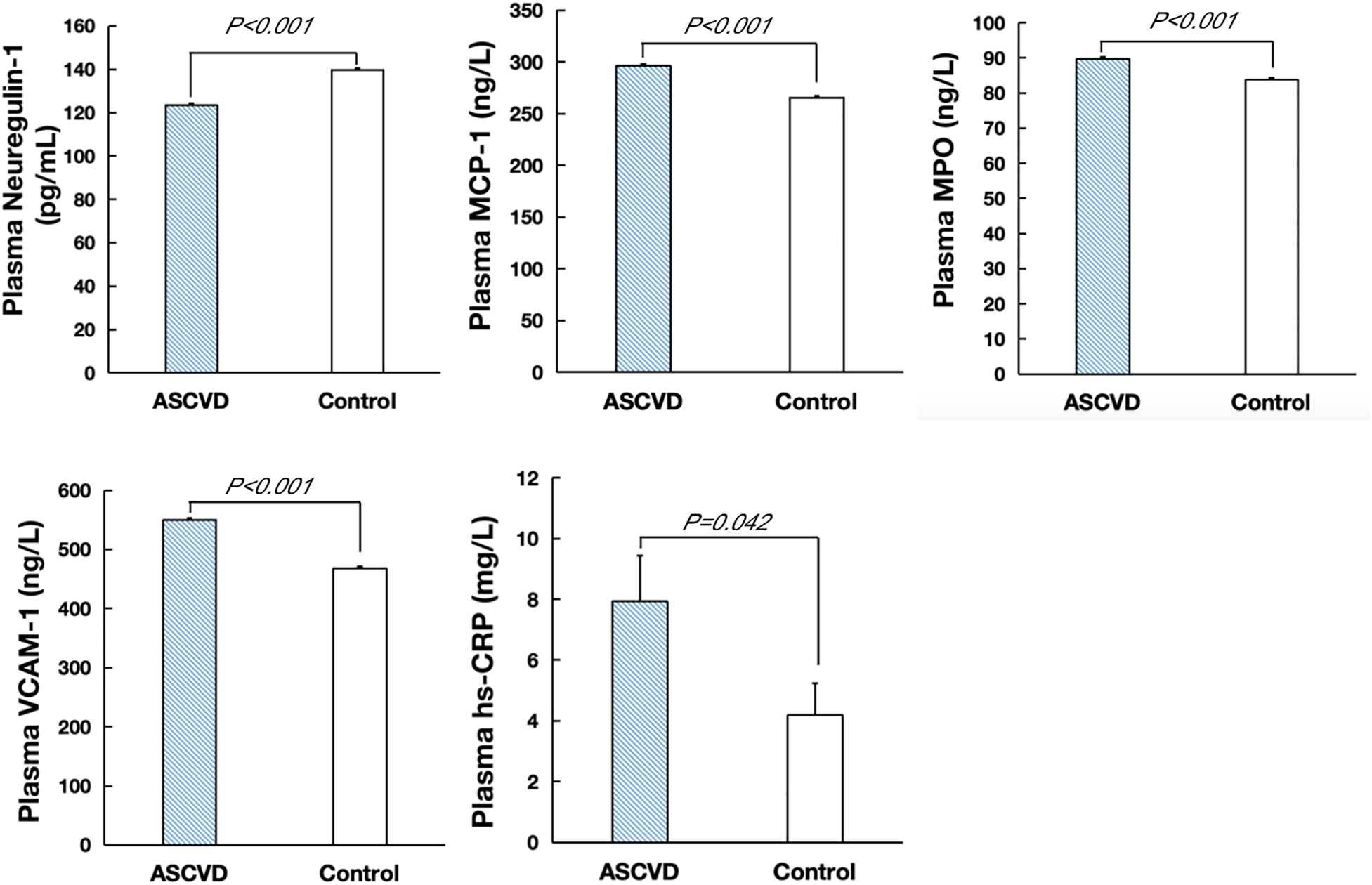 Plasma levels of NRG-1, MCP-1, MPO, VCAM-1 and hs-CRP in ASCVD and control groups.