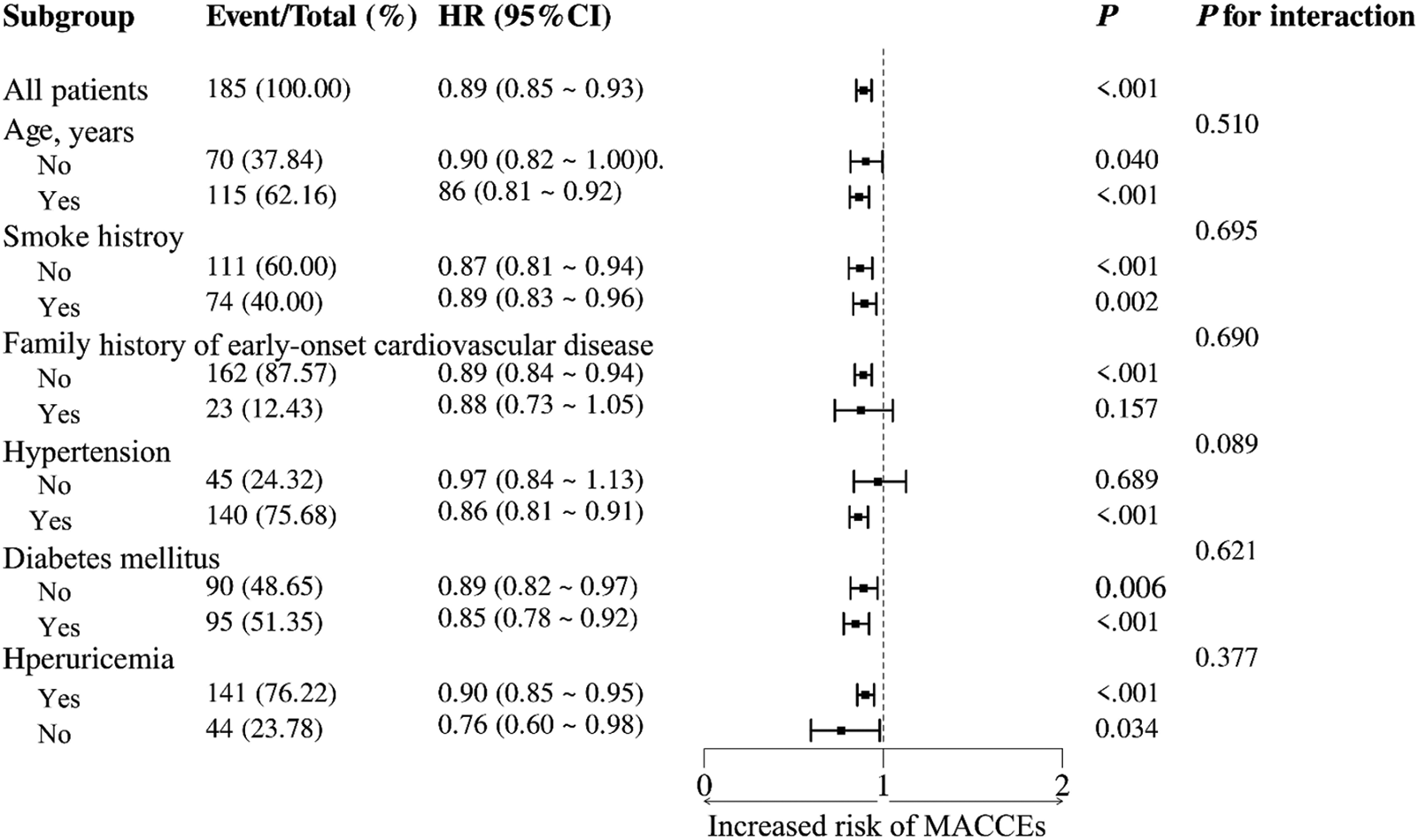 Demographic and clinical parameters were collected for all of the subjects at baseline. All participants were asked about their smoking status, family history of disease, use of medications, and medical history. Clinical parameters, including age, sex, BMI, blood pressure, heart rate (HR), and left ventricular ejection fraction (LVEF), were collected from medical records. Laboratory data, including liver and kidney function, uric acid, blood lipid, fasting blood glucose, and glycosylated hemoglobin data, were collected from the laboratory. The follow-up information for ASCVD patients was gathered by reviewing our medical records or by contacting the patients or their family members via phone every three months with a period of 14–16 months. The primary endpoint was the occurrence of major adverse cardiovascular and cerebrovascular events (MACCEs), including angina pectoris, nonfatal MI, nonfatal stroke, new HF symptoms, and CVD-related death. If the patient died, the cause of death was determined by taking a history from family members and reviewing medical records.