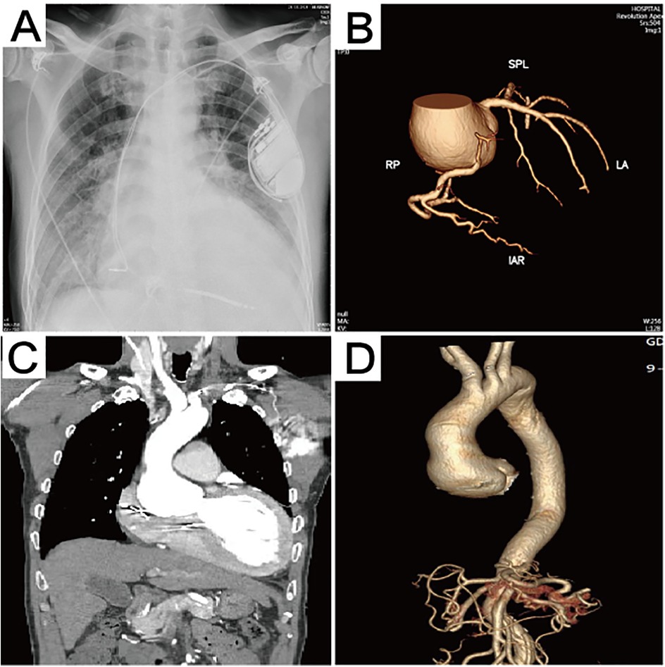 Figure 1. Preoperative imaging data. (A) The chest x-ray revealed the presence of pulmonary edema. (B) Computed tomography 3D reconstruction of the coronary arteries. (C) Preoperative computed tomography scan showing aortic sinus aneurysm, with the maximum aortic root diameter measuring 53.3 mm. (D) Computed tomography 3D reconstruction of the aorta.