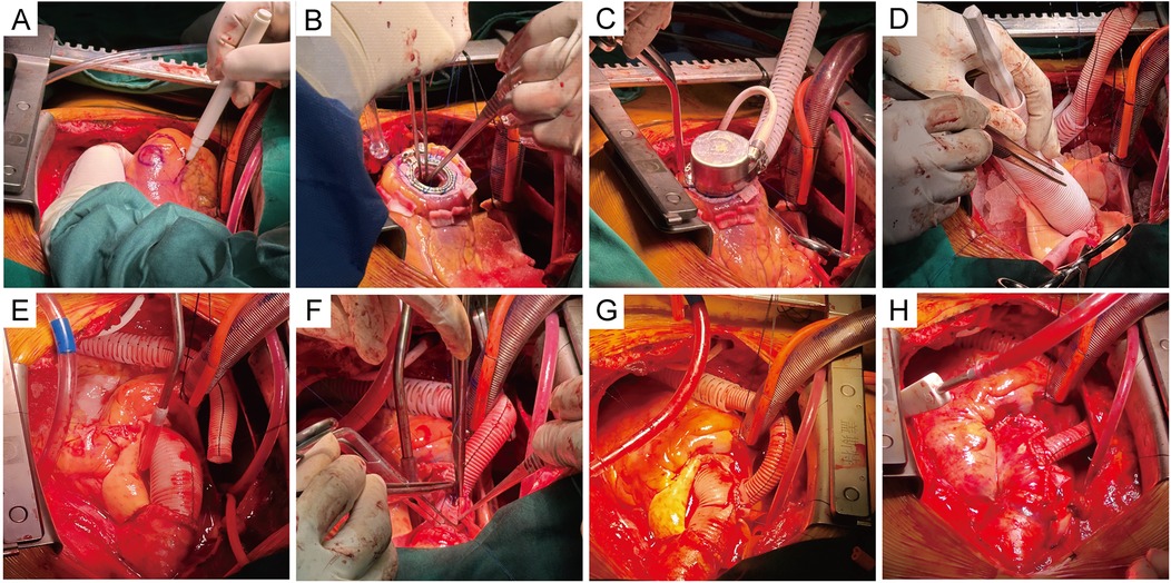 Figure 2. Intraoperative procedure. (A) The placement of the suture ring was selected and marked at the apex. (B) The LVAD ring was sewn on the marked region of the apex with Teflon-pledged sutures, and a 4-0 running Prolene suture was reinforced. The excess tissue in the ventricles was removed. (C) The inflow cannula was placed into the left ventricle and secured. (D) A separate 10-mm-diameter Dacron graft was anastomosed end-to-end to the left coronary. The composite conduit was sewn into place at the aortic annulus. (E) The anastomosis of the right and left coronary orifices was completed. (F) The latter conduit was anastomosed to the distal end of the aorta. (G) The cuff was sewn around the anastomosis on the ascending graft. The outflow graft was anastomosed end-to-side at the cuff on the ascending graft. (H) The ascending graft was wrapped using artificial pericardium and autologous vessel wall, and the Cabrol shunt technique was performed, showing the final surgical outcome.