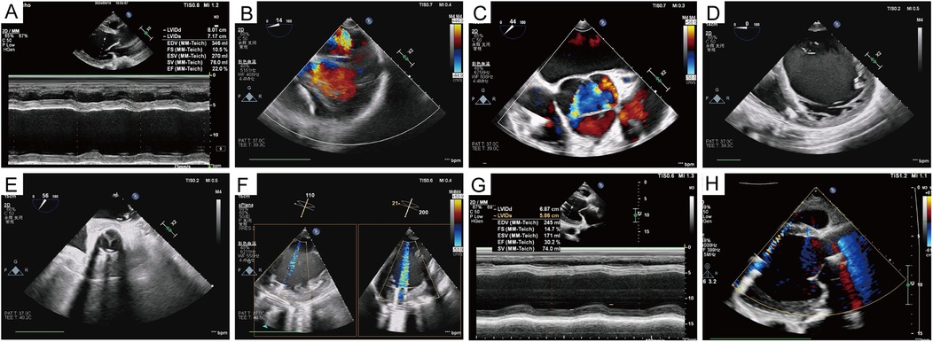 Figure 3. Echocardiographic data. (A) Preoperative ejection fraction and left ventricular diameter. (B–D) Mitral, aortic valve regurgitation, and left ventricular volume before left ventricular assist device implantation. (E) Opening and closing of the prosthetic valve. (F) The relationship between the inflow cannula of the left ventricular assist device and the mitral orifice and the ventricular septum was also demonstrated. (G,H) Left ventricular volume, as well as valve regurgitation, were significantly improved 1 year after the surgery.