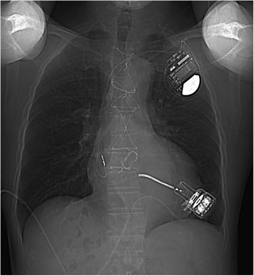 The patient exhibited oliguria on the first postoperative day (POD), accompanied by a rise in renal function index. The patient was placed on bedside continuous renal replacement therapy (CRRT). The patient's urine returned to a normal level on POD4. The patient was extubated on POD4. The patient had more pleural fluid postoperatively, which was deemed to be associated with exudate from the artificial vessel and the extensive surgical trauma. The drainage levels decreased, and the chest tube was subsequently removed on POD19. Heparin was administered, and the activated clotting time (ACT) was maintained at 160–200 s. The patient's warfarin was initiated on POD6, trying to maintain the international normalized ratio (INR) at 1.8–2.5. At 2 weeks postoperatively, the patient was able to ambulate and move without assistance. He was discharged on POD26 without any adverse events, while the LVAD achieved a pump flow of 3.08 L/min at 2,846 rpm. One year after the surgery, echocardiography revealed normal prosthesis function and reduced valve regurgitation, with an ejection fraction of 30% and an LVEDD of 68 mm (Figure 3). The chest x-ray taken 1 year after the patient was discharged from the hospital is shown in Figure 4.