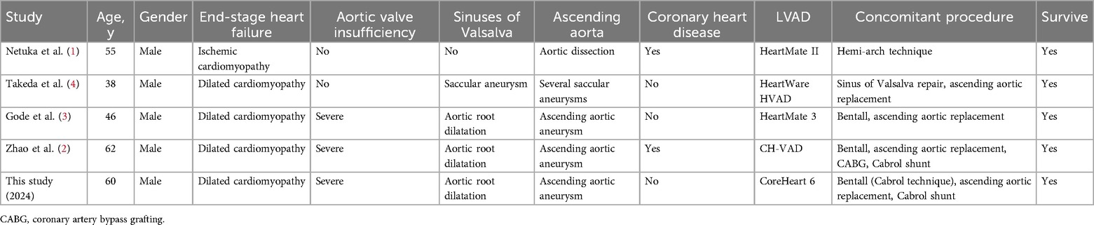 Certain prerequisites are necessary to assess the feasibility of surgery. Previous literature (1–4) has reported on this type of LVAD combined with aortic lesion treatment surgery, and the details are compared in Table 1. Preoperative cardiac echocardiography and right heart catheterization revealed satisfactory right heart reserve function. Although the patient presented with obvious heart failure upon admission, comprehensive treatment with cardiac stimulants, diuretics, and anti-heart failure drugs resulted in a good recovery of all the patient's organs, including the lungs, liver, and kidneys. Prompt intervention was required for severe aortic valve regurgitation combined with aortic root dilation. These complications may include rupture, dissection, and the formation of a pseudoaneurysm and can lead to life-threatening aortic events if left untreated. Our collaborative cardiac team includes cardiac surgeons, cardiologists, anesthetists, echocardiography specialists, and other experts. The cardiac surgeon is an expert in cardiac and aortic surgery.