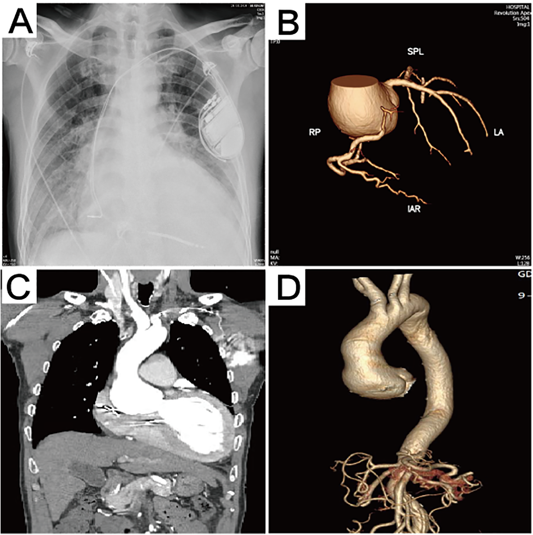 Preoperative imaging data. (A) The chest x-ray revealed the presence of pulmonary edema. (B) Computed tomography 3D reconstruction of the coronary arteries. (C) Preoperative computed tomography scan showing aortic sinus aneurysm, with the maximum aortic root diameter measuring 53.3 mm. (D) Computed tomography 3D reconstruction of the aorta.