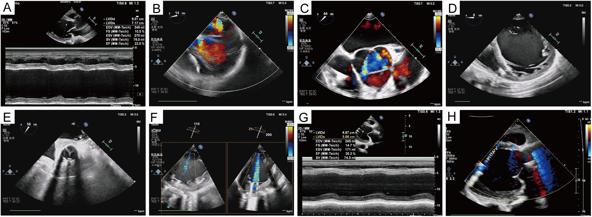 Echocardiographic data. (A) Preoperative ejection fraction and left ventricular diameter. (B–D) Mitral, aortic valve regurgitation, and left ventricular volume before left ventricular assist device implantation. (E) Opening and closing of the prosthetic valve. (F) The relationship between the inflow cannula of the left ventricular assist device and the mitral orifice and the ventricular septum was also demonstrated. (G,H) Left ventricular volume, as well as valve regurgitation, were significantly improved 1 year after the surgery.