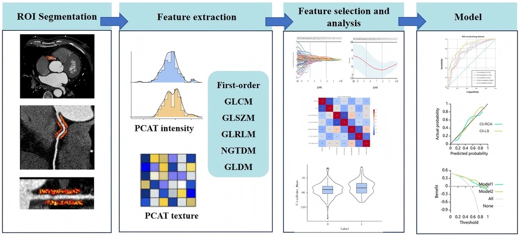 With the continuous advancement of artificial intelligence technology, the application of radiomics in the field of medical research is expanding. In addition to coronary inflammation due to PCAT, radiomics can also capture spatial structural changes of irreversible PCAT, such as lipofibrosis and microvascular remodeling (9). Numerous studies have confirmed the superiority of radiomics of PCAT in the prediction of adverse cardiovascular events (10–12), and the radiomics model of PCAT in the RCA is superior to the radiomics model of PCAT in the other two coronary arteries (13). It has also been demonstrated (14) that imaging histology models of lesion-specific PCAT have a higher value than traditional risk factors in MACE prediction.