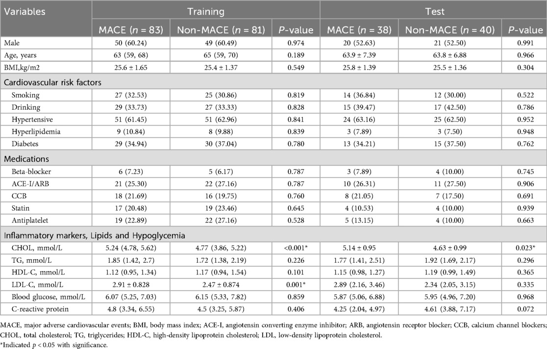 Through PSM analysis, a total of 242 patients were successfully matched between the MACE group (n = 141) and the non-MACE group (n = 141) (Figure 1). Clinical characteristics of the training group (n = 164) and the test group (n = 78) are shown in Table 1. In the training and test groups, MACE patients and non-MACE patients were well matched with respect to sex, age, body mass index(BMI), cardiovascular risk factors, and medications, with no significant differences between the two groups (P > 0.05). The average duration between the CCTA examination and the occurrence of MACE was 15.7 ± 7.96 months. Based on the training group, total cholesterol (TC) and low-density lipoprotein cholesterol (LDL-C) were significantly associated with MACE in univariate analyses. Among the patients with MACE, there were 2 cases of cardiac death (1.65%), 4 cases of malignant arrhythmia (3.3%), 19 cases of nonfatal acute myocardial infarction (15.7%), 5 cases of new-onset congestive heart failure (4.8%), and 36 cases of coronary artery revascularization (29.75%), and 55 cases of readmission for unstable angina (45.45%).