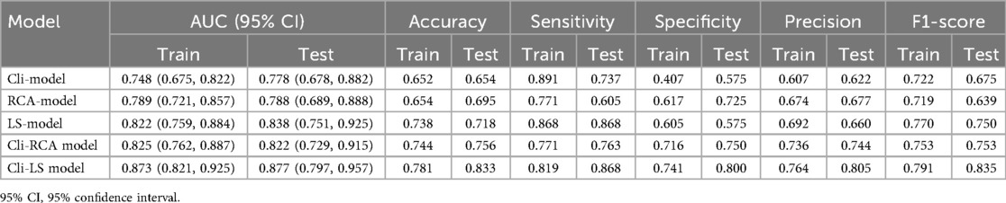 The ROC curves for the training and testing groups of each model are shown in Figure 4. Compared with the RCA-model [AUC = 0.789 (95% CI: 0.721–0.857), AUC = 0.788 (95% CI: 0.689–0.888)], the LS-model [AUC = 0.822 (95% CI: 0.759–0.884), AUC = 0.838 (95% CI: 0.751–0.925)] had superior predictive performance. The predictive performance of the clinical and radiomics features integration model was improved. Compared with the Cli-RCA model [AUC = 0.825 (95% CI: 0.762–0.887), AUC = 0.822 (95% CI: 0.729–0.915)], Cli-LS model [AUC = 0.873 (95% CI: 0.821–0.925), AUC = 0.877 (95% CI: 0.797–0.957)] still possessed a superior prediction performance for MACE. DeLong test showed that the training and test groups' AUC were not significantly different (p > 0.05). The AUC, accuracy, sensitivity, specificity, precision, and F1-Score of each model are detailed in Table 2.
