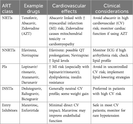 Table 1. Summary of cardiovascular effects and clinical considerations for antiretroviral therapy (ART) drug classes. This table outlines common ART classes, representative drugs, associated cardiovascular effects, and relevant clinical considerations to guide therapy selection in people living with HIV at risk for cardiovascular disease.