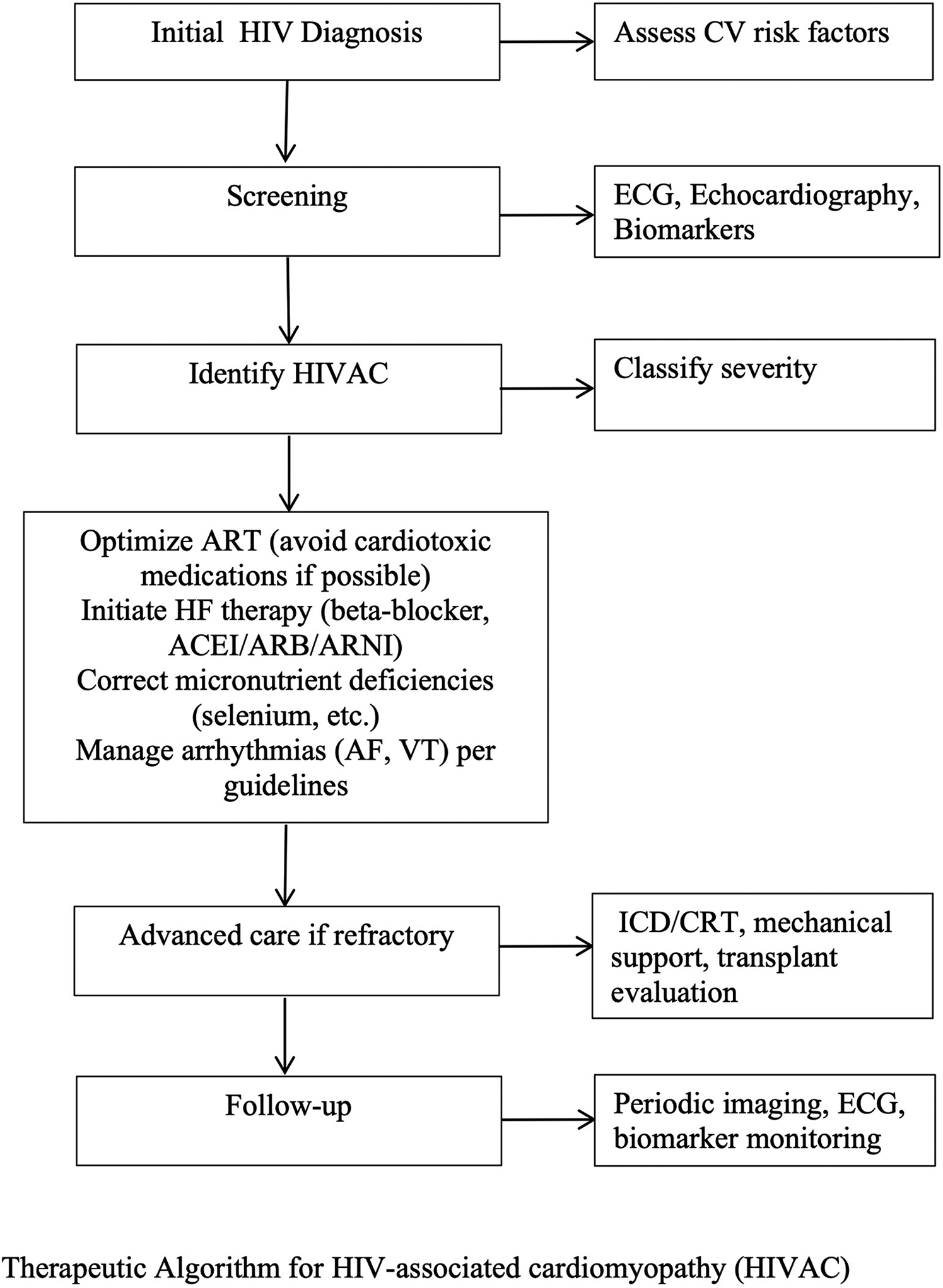 Therapeutic algorithm for HIV-associated cardiomyopathy (HIVAC). This stepwise approach begins with initial HIV diagnosis and cardiovascular risk assessment, followed by targeted screening and identification of HIVAC with severity classification. Management includes optimization of antiretroviral therapy, initiation of guideline-directed heart failure therapy, correction of micronutrient deficiencies, and arrhythmia management. Advanced interventions such as ICD/CRT, mechanical circulatory support, or heart transplantation are considered for refractory cases, with ongoing follow-up incorporating imaging, ECG, and biomarker monitoring.