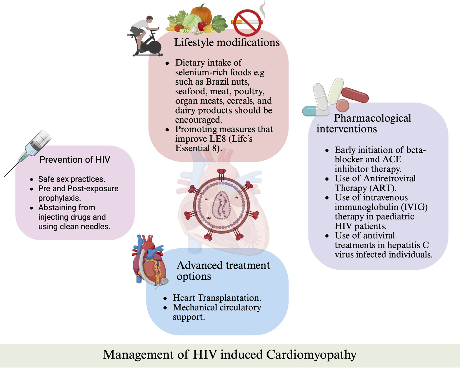 Management strategies for HIV-associated cardiomyopathy. Overview of preventive measures, lifestyle interventions, pharmacologic treatments (including ART, beta-blockers, ACE inhibitors, and IVIG), and advanced therapies such as mechanical circulatory support and heart transplantation.