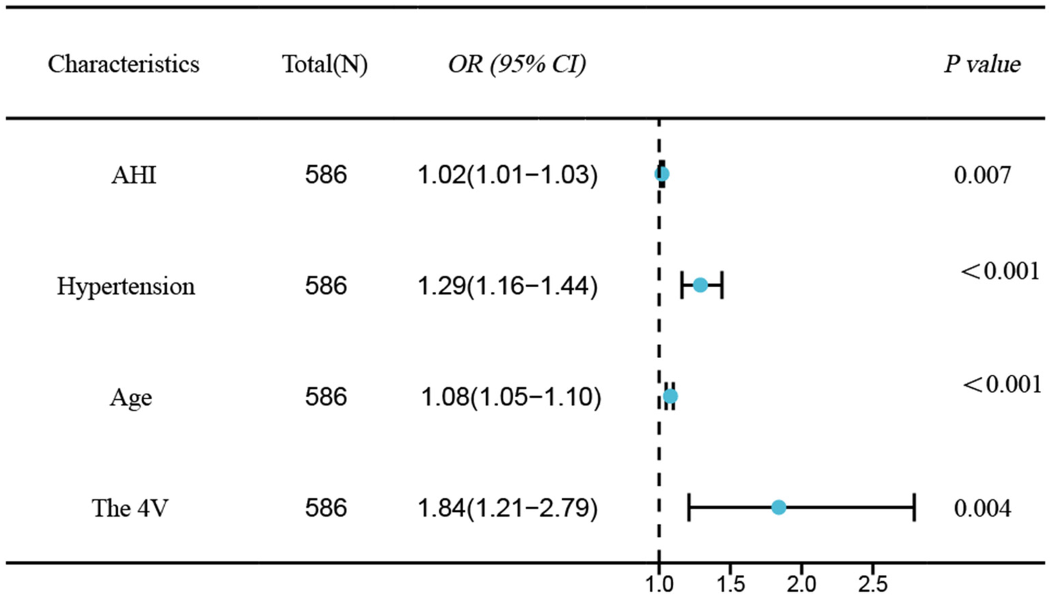 BMI, body mass index; BUN, blood urea nitrogen; Scr, serum creatinine; TG, triglyceride; TC, total cholesterol; HDL-C, high-density lipoprotein cholesterol; LDL-C, low density lipoprotein cholesterol; ALT, alanine aminotransferase; AST, aspartate aminotransferase; FBG, fasting blood glucose; 24 h SBP, 24-hour systolic blood pressure; 24 h DBP, 24-hour diastolic blood pressure; AHI, apnea hypopnea index; MSaO2, mean arterial oxygen saturation; LSaO2, lowest arterial oxygen saturation; 4 V, the four-variable screening tool; SBQ, STOP-Bang Questionnaire; BQ, Berlin Questionnaire. OR, Odds Ratio; CI, Confidence Interval; HTN, hypertension; DM, diabetes; FH, family history
