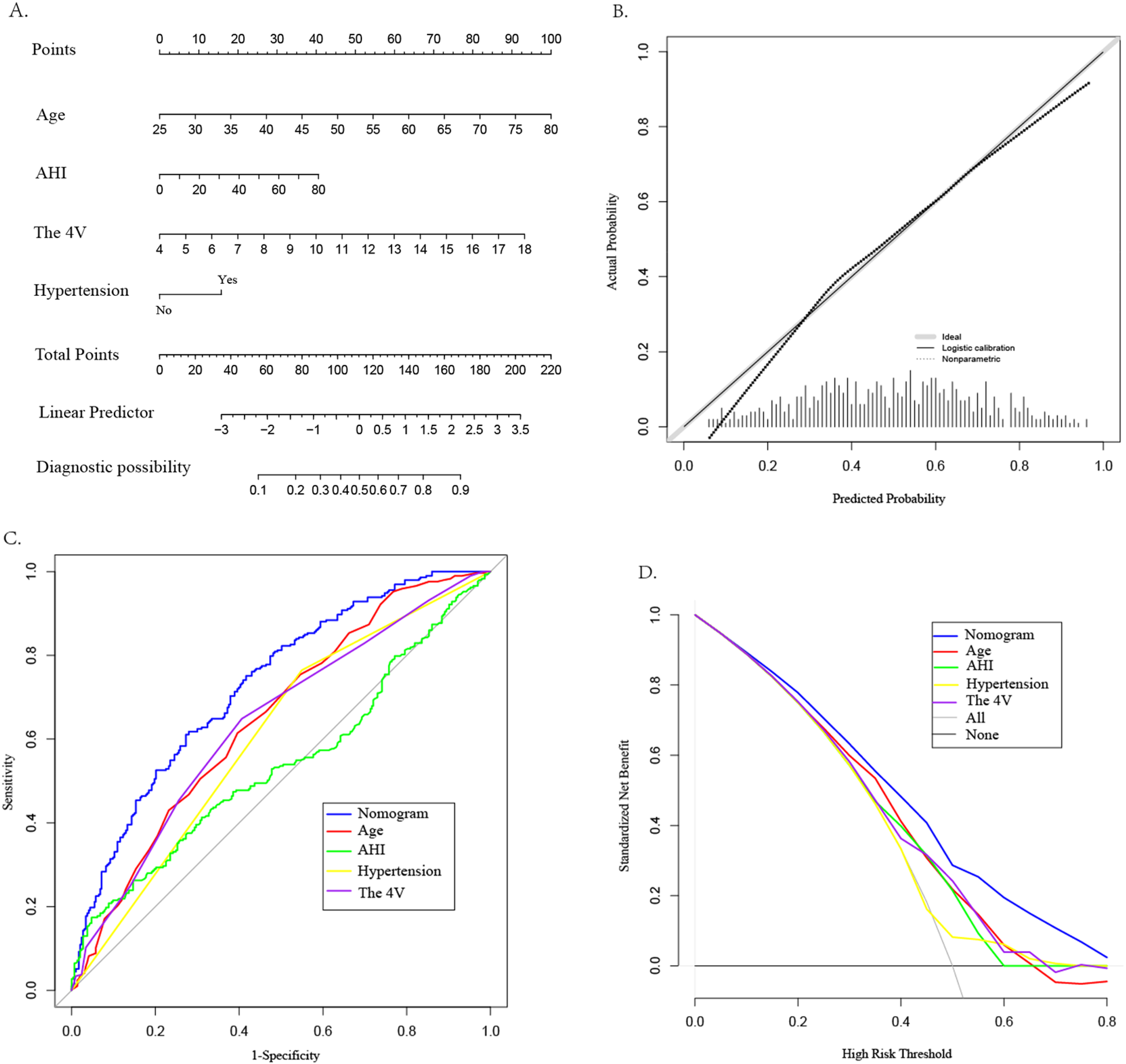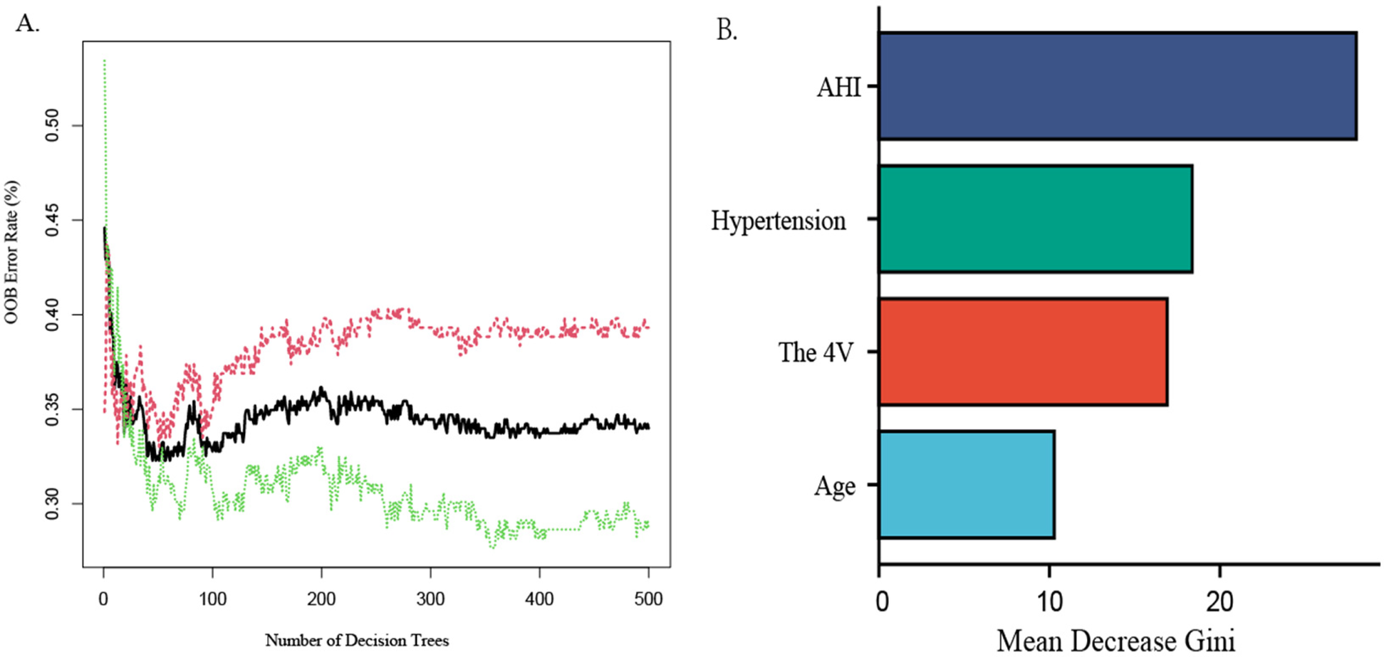 LASSO-logistic regression analysis revealed age (OR = 1.07, 95% CI: 1.05–1.1, P < 0.001), hypertension (OR = 1.29, 95% CI: 1.16–1.44, P < 0.001), AHI (OR = 1.02, 95% CI: 1.01–1.03, P = 0.007), and the 4 V (OR = 1.84, 95% CI: 1.21–2.79, P = 0.004) were independently associated with OSAHS plus CAD. The analysis of the ROC curve revealed that the combined utilization of the aforementioned predictors significantly enhances the potential predictive capability for patients with OSAHS developing CAD. The Hosmer-Lemeshow test, calibration curve, and DCA results indicate that potential predictive model based on the 4 V possesses significant clinical applicability in predicting OSAHS in conjunction with CAD. A comprehensive analysis utilizing the random forest machine learning algorithm demonstrated that the AHI exhibits the highest predictive value. Furthermore, the model's performance, as evaluated through out-of-bag error assessment, suggests robust efficacy. The correlation analysis results showed that the scores of the four-variable screening tool were positively correlated with the Gensini scores.