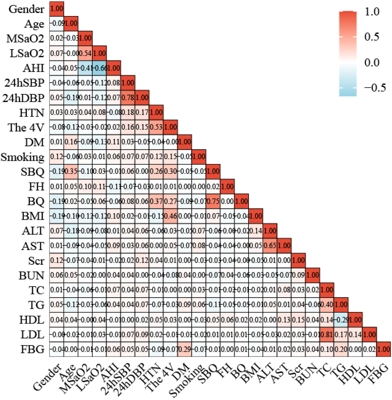 The general information of the patients, including gender, age, medical history (such as history of hypertension and diabetes), family history, smoking history, and snoring status, was systematically recorded. Additionally, the neck circumference (in cm), height (in m²), and weight (in kg) of the patients were documented. The Body Mass Index (BMI) was calculated using the formula weight/height² (kg/m²). (2) Fasting blood sample collection was carried out the next morning following an 8 h fasting. Blood urea nitrogen (BUN), serum creatinine (Scr), triglycerides (TG), total cholesterol (TC), high-density lipoprotein cholesterol (HDL-C), low-density lipoprotein cholesterol (LDL-C), alanine aminotransferase (ALT), aspartate aminotransferase (AST) and fasting blood glucose (FBG) were measured using a Roche C8000 fully automated biochemical analyzer (Roche Diagnostics GmbH, Germany). (3) A Welch Allyn 6,100 dynamic blood pressure monitor was used to perform 24 h ambulatory blood pressure monitoring(blood pressure after medication). 24 h systolic (24 h SBP) and diastolic (24 h DBP) blood pressure levels were recorded upon completion of the monitoring.