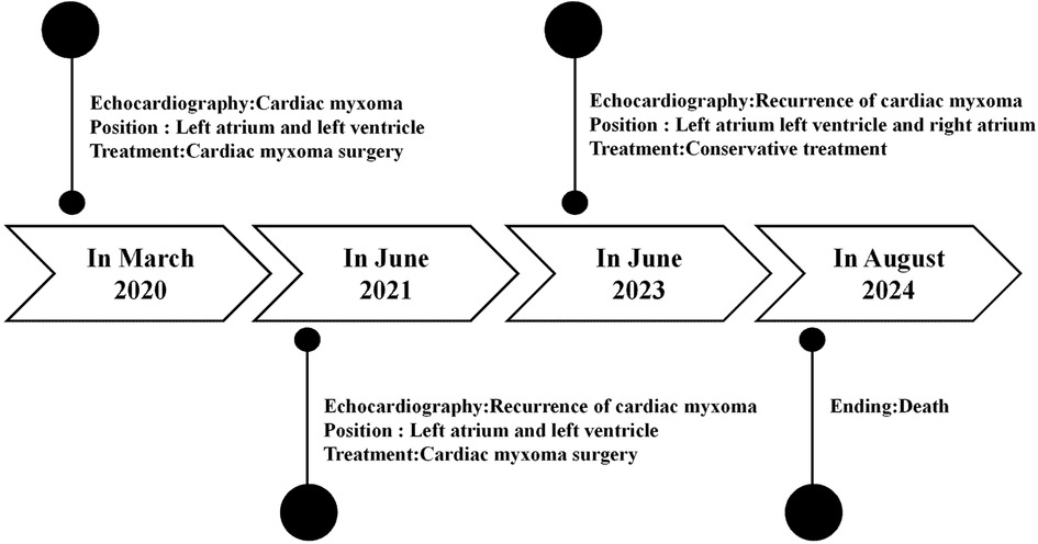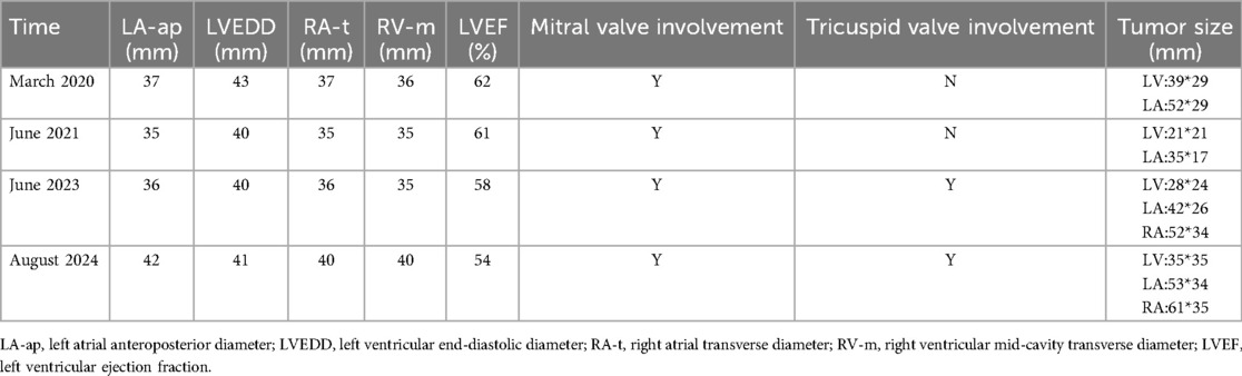 The recurrence occurred 21 months after the second surgery. The tumor had increased in size compared to prior assessments, and symptoms indicative of global heart failure had already manifested. Considering the patient's genetic background, symptomatic treatment and heart transplantation were recommended. Unfortunately, the patient died while waiting for a donor (Figure 2).