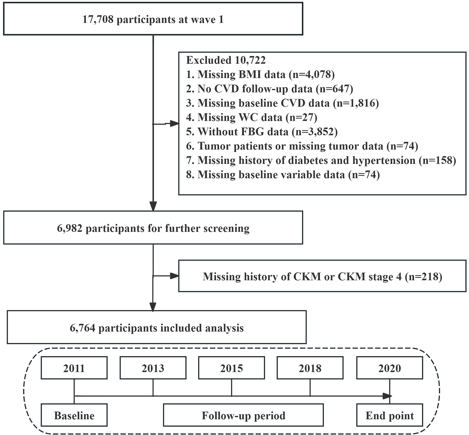 We used data from the first wave (2011–2012) for this analysis, focusing on participants for whom blood sample data were available. The data analysis excluded cases under the following criteria: those lacking BMI data (n = 4,078), participants without CVD follow-up information (n = 647), participants missing baseline CVD details (n = 1,816), those without WC data (n = 27), participants lacking FBG data (n = 3,852), tumor patients or participants with missing tumor information (n = 74), participants lacking a history of diabetes and hypertension data (n = 158), and instances missing baseline variable data (n = 74). Finally, participants without CKM data and those in CKM stage 4 were excluded (n = 218). 6,764 participants were included in this study for analysis (Figure 1).