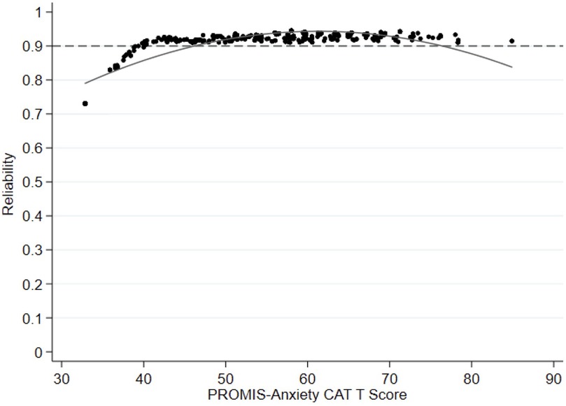 Our results showed excellent reliability of the PROMIS-A CAT, with individual-level reliability demonstrated by minimal standard error of measurements across the spectrum of PROMIS-A T-scores. This standard of high reliability is a built-in strength of PROMIS CAT, as standard stopping rules require a low standard error (theta <0.3) to stop additional testing (24, 25). Individual-level reliability decreased for participants with the least anxiety (lowest T-scores). This is not of clinical relevance, particularly if the tool is used for screening, as this score range falls well below the cut-off for potentially clinically significant symptom severity.