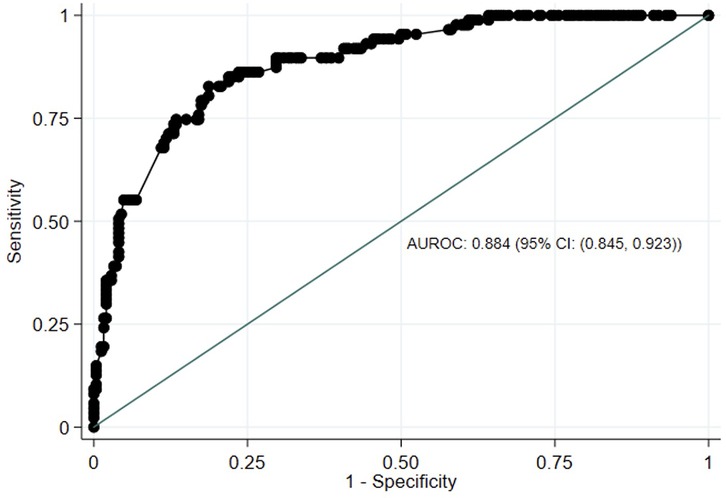ROC curve chart showing the relationship between sensitivity and one minus specificity. The curve rises steeply, demonstrating good test accuracy, with an AUROC of 0.884 and a 95% confidence interval of 0.845 to 0.923.
