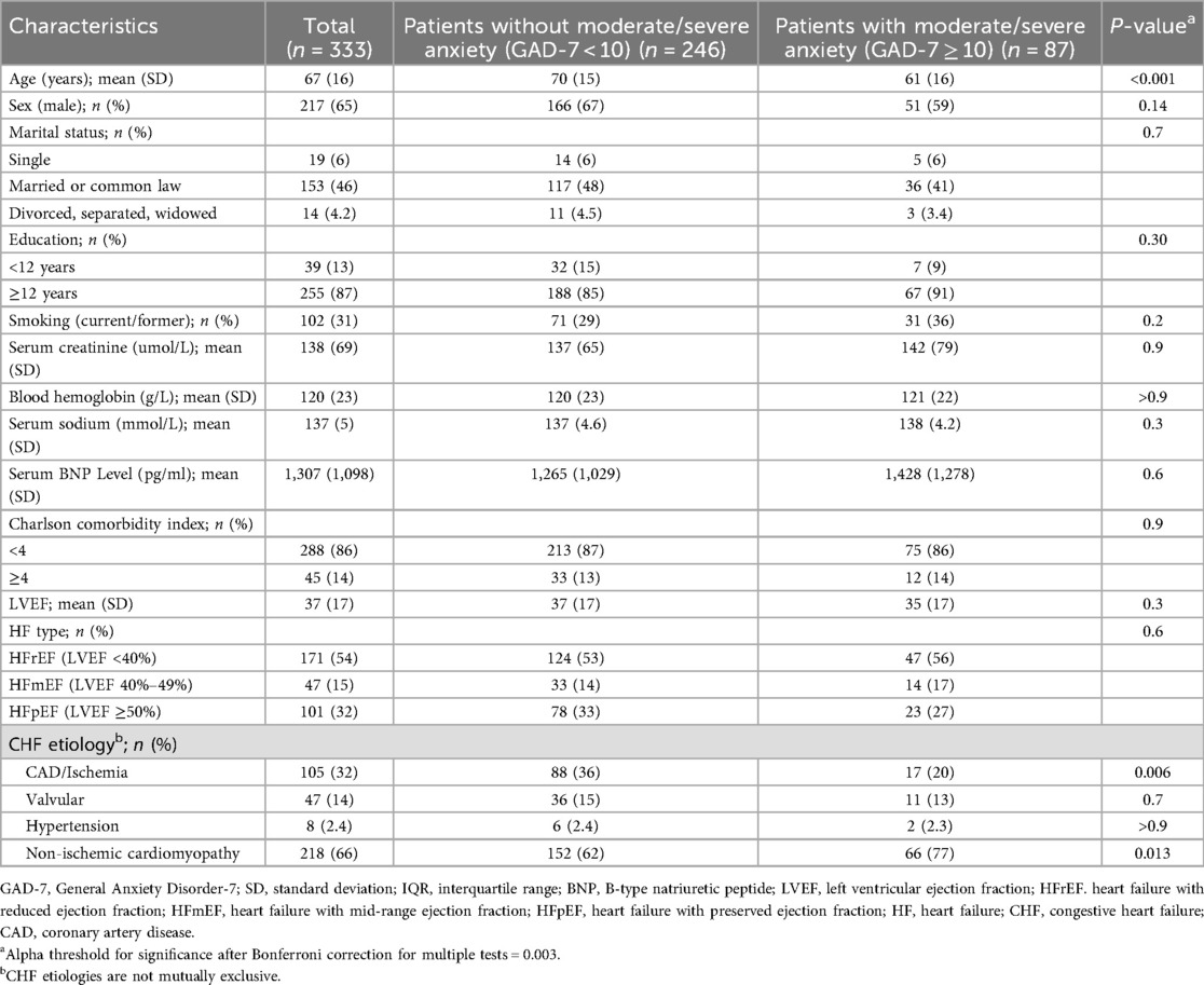 Among the 520 patients enrolled in the main study, 333 completed both PROMIS-A CAT and legacy instruments for validation. Participant characteristics are presented in Table 1. Mean (SD) age was 67 (16) years with 217 (65%) male participants. Of these participants, 87 (26%) had moderate to severe anxiety (GAD-7 score ≥ 10). The most common etiology of HF in this cohort was non-ischemic cardiomyopathy, affecting 218 (66%) participants; those with non-ischemic cardiomyopathy made up a higher proportion of the moderate to severe anxiety cohort (77% vs. 62%, p = 0.013). Those with moderate to severe anxiety were younger [mean (SD) age 61 (16) vs. 70 (15) years, p < 0.001].