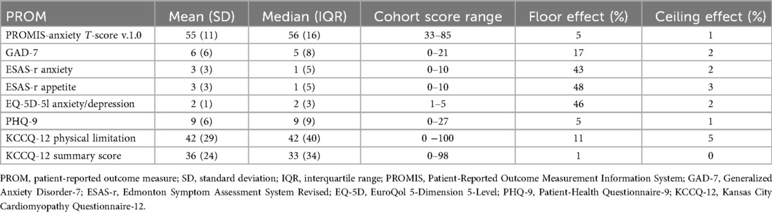 Baseline descriptive statistics are presented as mean (SD) for normally distributed variables, median [interquartile range (IQR)] for skewed variables, and frequency (%) for categorical variables. Characteristics between participants with vs. without moderate/severe anxiety (cut-off score: GAD-7 ≥10) were compared using independent sample T-tests for normally distributed variables and Mann–Whitney U-tests for nonparametric variables. Normality was assessed by a visual inspection of a density plot and QQ-plot for all variables, as well as Pearson's coefficient of skewness for PROMs scores. Categorical variables were compared using chi-squared tests. Bonferroni correction for multiple tests was used to determine a significant alpha threshold by dividing an alpha of 0.05 by number of tests performed (43). Floor and ceiling effects were calculated as the percentage of participants who scored at the minimum and maximum possible questionnaire score, respectively. Skewness of PROM scores was quantified using Pearson's moment coefficient of skewness. A coefficient of 0 represents a symmetric distribution (i.e., normal distribution); a large positive coefficient indicates a right-skewed distribution, whereas a large negative coefficient indicates left-skewness (44).