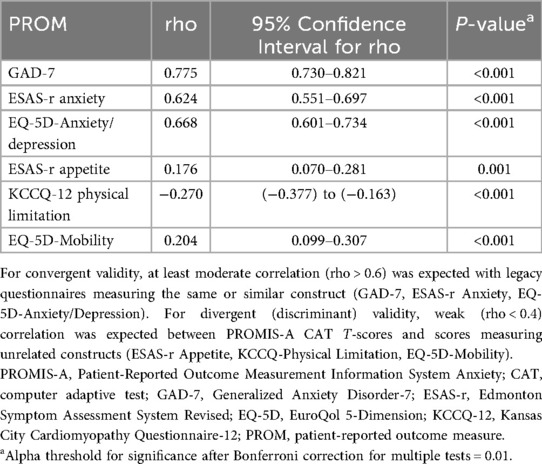 Convergent validity was assessed by examining T-score correlations between PROMIS-A CAT and legacy measures assessing the same or similar construct (GAD-7, ESAS-r Anxiety, and EQ-5D-Anxiety/Depression). Moderate correlation (rho 0.5–0.7) is considered acceptable, while a strong correlation (rho >0.7) shows excellent validity (47, 48). Divergent (discriminant) validity was assessed by examining T-score correlations between PROMIS-A CAT and tools measuring constructs unrelated to anxiety (ESAS-r Appetite, KCCQ-Physical Limitation, and the EQ-5D-Mobility). We expected weak correlations (rho < 0.4) between these measures (49).