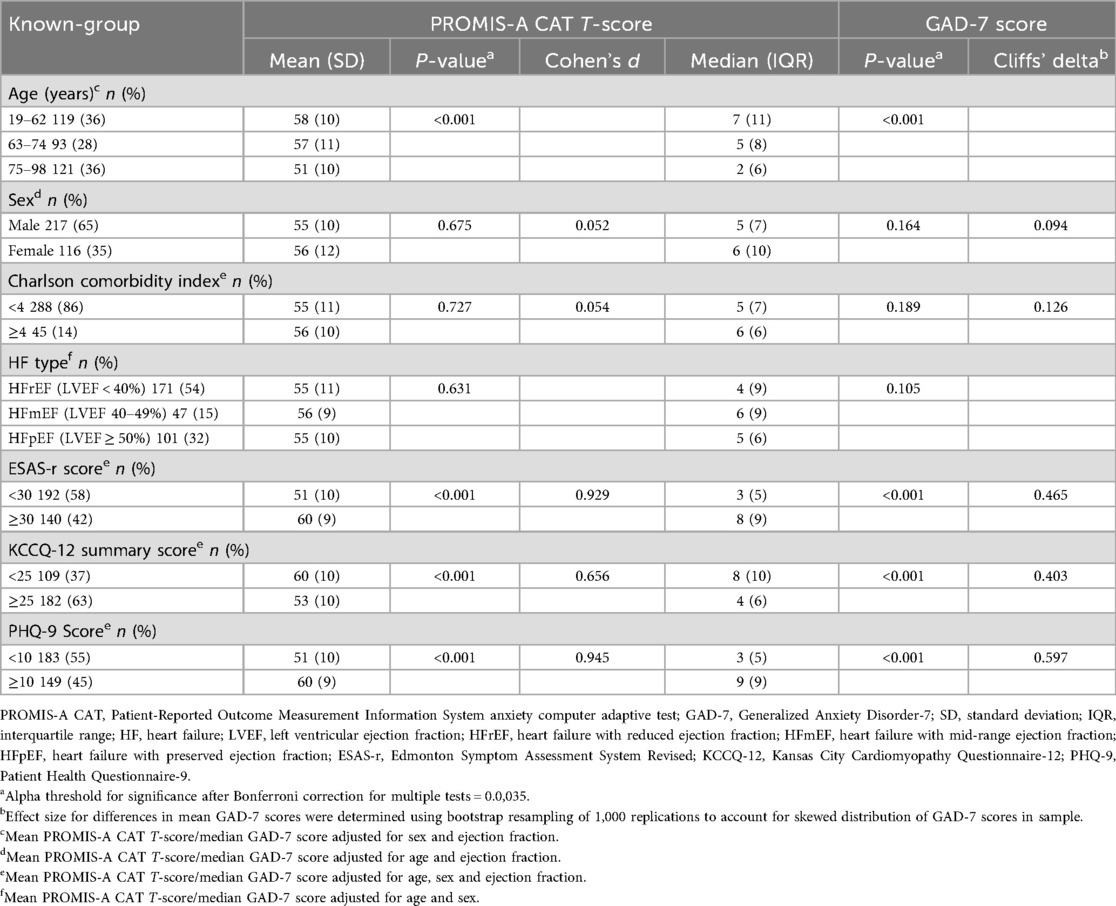 To further analyze construct validity, we compared mean PROMIS-A CAT T-scores and median GAD-7 scores between groups expected to have different levels of anxiety. We expected higher anxiety among participants who were female (50), were younger (51), had HFrEF (52), and had greater comorbidity (53). We established additional groups based on legacy PROMs. We used the ESAS-r symptom score cut-off ≥30 to define high global symptom burden and expected these participants to have higher anxiety (23). We used a PHQ-9 score (cut-off ≥ 10) to define moderate to severe depressive symptoms and expected these participants to have higher anxiety (41, 54). Lastly, we used the KCCQ-12 summary score (cut-off ≥ 25) to indicate good HRQOL, expecting participants with impaired HRQOL (<25) to have higher average anxiety (55). For the known group analyses, PROMIS-A CAT T-scores and GAD-7 scores were adjusted for age, sex, and EF. Adjusted PROMIS-A CAT T-scores were obtained from linear regression model least-squared means. Adjusted median GAD-7 scores were obtained from quantile regression predicted medians. Group comparisons of adjusted mean PROMIS-A CAT T-scores and adjusted median GAD-7 scores were conducted using independent sample T-tests for binary group PROMIS-A CAT T-scores, Mann–Whitney U-tests for binary group GAD-7 scores, analysis of variance (ANOVA) for PROMIS-A CAT T-scores with more than 2 groups, and Kruskal–Wallis tests for GAD-7 scores with more than 2 groups. Cohen's D effect size was calculated for all binary comparisons of PROMIS-A CAT T-scores, which was classified as classified as 0–0.49 (small), 0.5–0.79 (moderate), and >0.8 (large) (56). To account for the skewed distribution of GAD-7 scores, bootstrap resampling with 1000 replication was used to estimate Cliff's delta effect size—classified as 0–0.32 (small), 0.33–0.46 (moderate) >0.47 (large) (57).