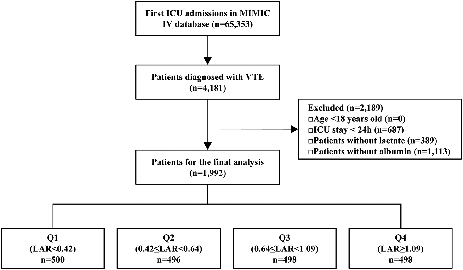 This retrospective cohort study was conducted using data from the MIMIC-IV 3.1 database. Patients admitted to the ICU with a documented diagnosis of VTE were included in the analysis. VTE diagnoses were identified based on International Classification of Diseases (ICD-9/10) codes and considered eligible if they were recorded as the primary diagnosis either at the time of ICU admission or incidentally during the ICU stay. To ensure consistency of analysis, the time origin (exposure start) was uniformly defined as the date of ICU admission, regardless of whether the VTE was present at admission or occurred during the ICU stay. Only the first ICU admission was considered for each patient. In the MIMIC-IV database, discharge diagnoses are recorded for each patient. Following previous practice, we considered the first five discharge diagnoses as the primary diagnoses. Ninth Revision (ICD-9) codes: 45119, 4512, 45181, 45182, 45183, 45184, 45189, 4519, 4532, 4538, 45381, 45382, 45383, 45384, 45385, 45386, 45387, 45389, 4539, 4150, 41511, 41512, 41513, 41519, 45340, 45341, 45342, 4510, 452, 4530, 4531, and 4533.Corresponding diagnoses in the International Classification of Diseases, Tenth Revision (ICD-10) were identified using the following codes: I808, I809, I8290, I82890, I2699, I2692, I2690, I2602, I2609, I8000, I8001, I8002, I81, I820, and I821.A total of 65,353 first ICU admissions were recorded in the database, with 4,181 patients diagnosed with VTE. The following exclusion criteria were applied: patients <18 years (n = 0), and with ICU stays shorter than 24 h (n = 687),those without lactate data (n = 389), and those missing albumin data (n = 1,113). Following the exclusions, a total of 1,992 patients were retained for the final analysis. For further analysis, patients were stratified into quartiles based on their LAR. Q1 included patients with LAR < 0.42 (n = 496); Q2 included patients with 0.42 ≤ LAR < 0.64 (n = 496); Q3 included patients with 0.64 ≤ LAR < 1.09 (n = 498); and Q4 included patients with LAR ≥ 1.09 (n = 498) (Figure 1).