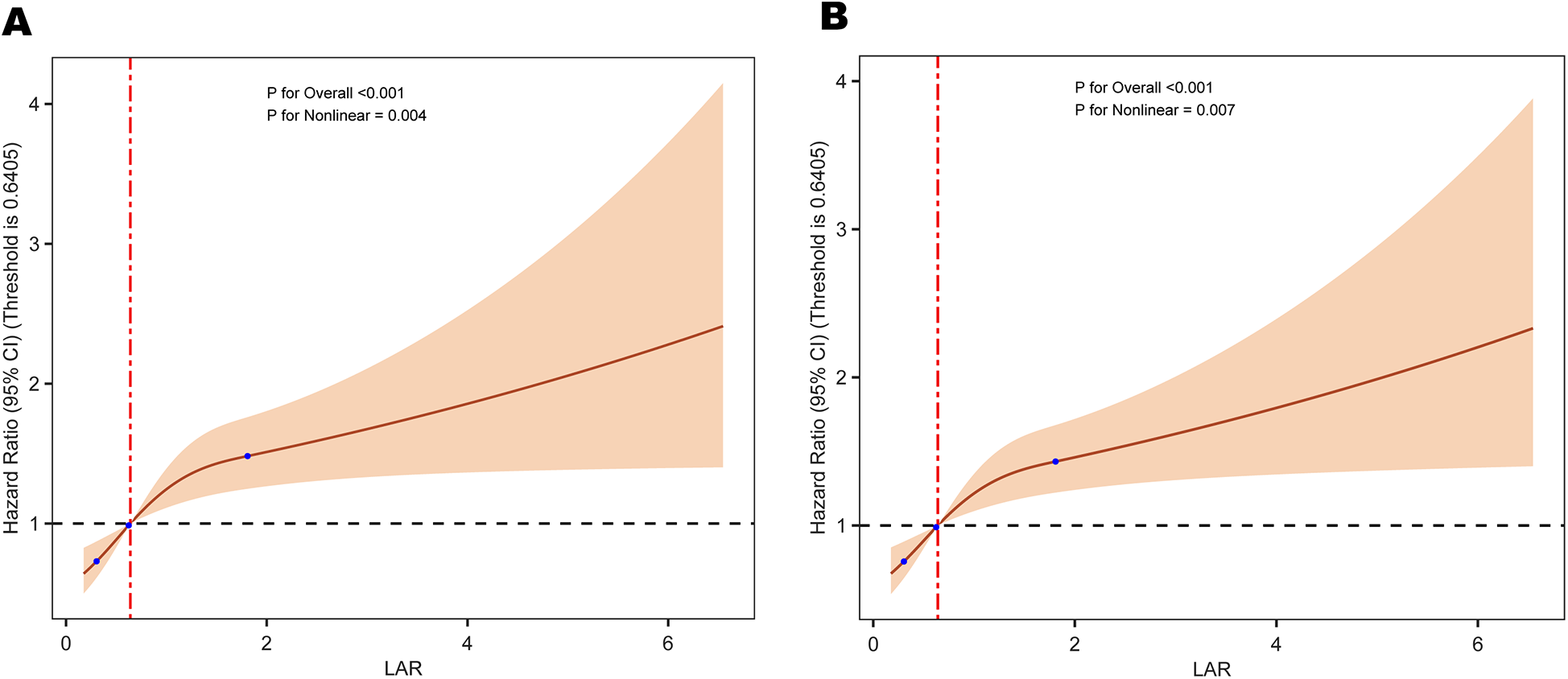 Baseline characteristics were analyzed across LAR quartiles using appropriate statistical methods. Continuous variables were reported as mean ± standard deviation (SD) or median with interquartile range (IQR), depending on data distribution. Categorical variables were summarized as frequencies and percentages. For group comparisons, one-way analysis of variance (ANOVA) or the Kruskal–Wallis test was applied to continuous variables, while categorical variables were assessed using the chi-square test, as appropriate.