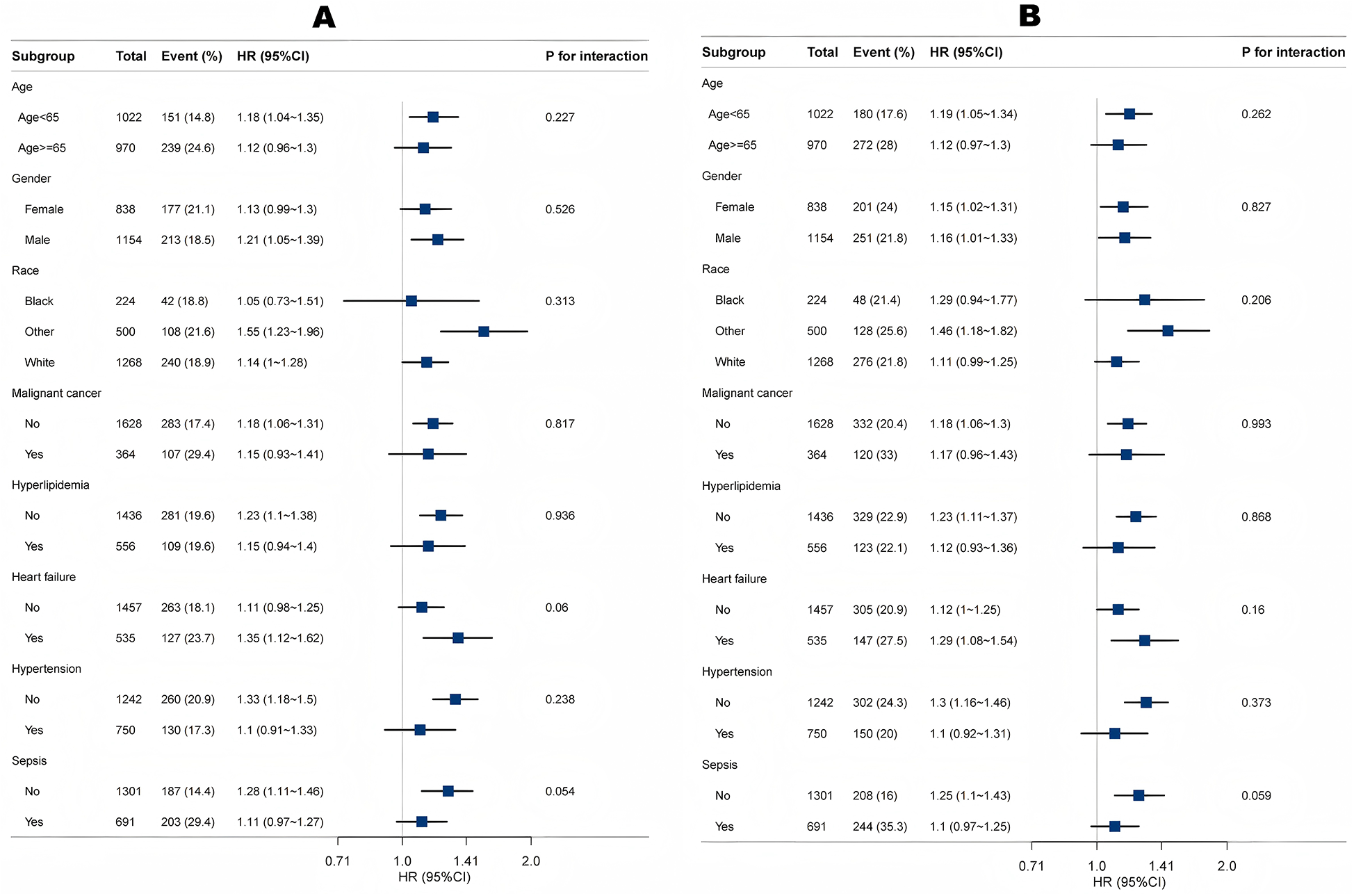 Univariate regression analyses were conducted to examine the association between LAR and mortality (Supplementary Table 1). Confounders were selected based on the following criteria: (1) variables with a potential significant impact on outcomes according to prior research and (2) covariates with a P-value <0.05 in univariate analyses. Subsequently, Cox proportional hazards models were constructed to assess the relationship between LAR and both 30-day and 365-day mortality. To mitigate potential confounding effects between LAR and outcomes, three models were developed to estimate hazard ratios (HR) and 95% confidence intervals (CI), with trend tests performed across quartiles. Model 1 was unadjusted, while Model 2 included adjustments for age, weight, gender, race, heart rate, SpO2, respiratory rate, hematocrit, hemoglobin, RBC, WBC, bilirubin, creatinine, BUN, PCO2, pH, INR, PT, and PTT. Model 3 incorporated additional adjustments for SOFA score, APS III, AKI, hyperlipidemia, heart failure, coronary heart disease, hypertension, malignant cancer, ventilation, and CRRT. Trend analyses across quartiles were also performed. Restricted cubic spline (RCS) analysis was applied to explore potential non-linear relationships. Kaplan–Meier (KM) survival analysis, combined with the log-rank test, was used to evaluate differences in primary outcomes across LAR quartiles. Additionally, receiver operating characteristic (ROC) curves were constructed to assess the predictive performance of LAR. Stratified and interaction analyses were conducted based on age, gender, race, malignant cancer, hyperlipidemia, heart failure, coronary heart disease, and hypertension. Finally, Pearson correlation analyses were performed to examine the relationship between LAR and various severity indices. The data analysis was conducted using R software version 4.4.1 and Free Statistics software version 2.0 P-values <0.05 were considered statistically significant.