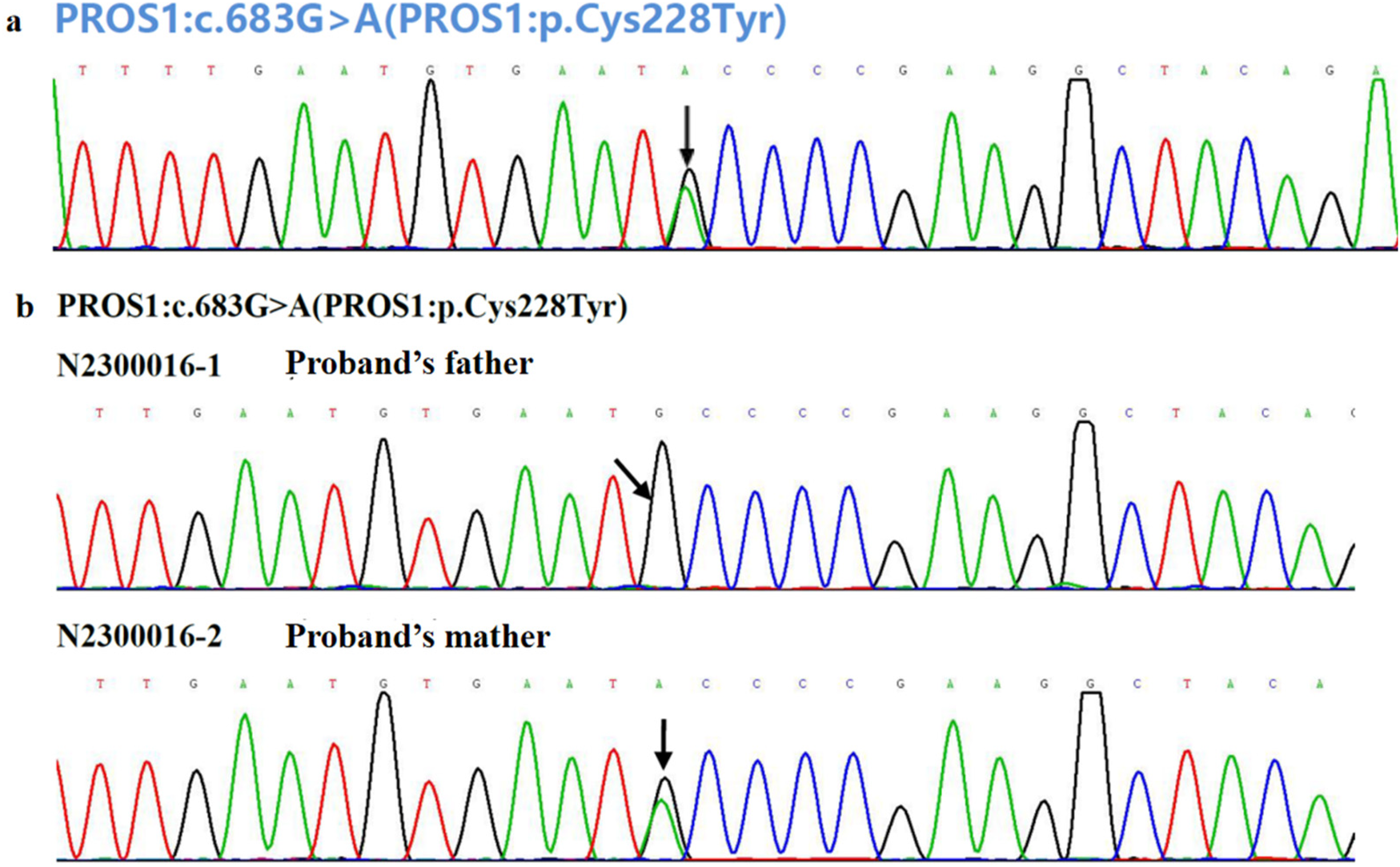 To investigate the cause of the thromboembolism, thrombophilia screening was performed. PS activity was markedly reduced (53.3%; male reference range: 63.5%–149%). Genetic analysis was conducted to identify potential genetic causes of PS deficiency. A combination of single-gene Sanger sequencing and next-generation sequencing (NGS), including whole-exome sequencing (WES), was employed, achieving 99.93% genome coverage with an average coverage depth of 112×. Genes encoding anticoagulant proteins, coagulation factors, and fibrinolytic regulators were analyzed. A rare heterozygous mutation in the PROS1 gene (c.683G>A; p.Cys228Tyr) was identified (Figure 3a). This variant was present in both the patient and his mother but absent in his father (Figures 3b, 4).