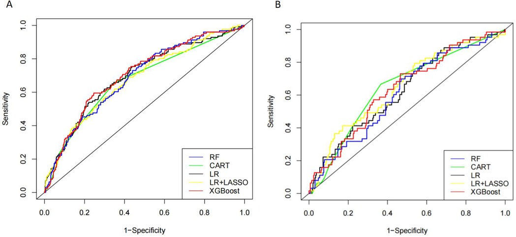 Figure 2. Receiver operating characteristic (ROC) curves of five different models in internal validation cohort (A) and time-external validation cohort (B).