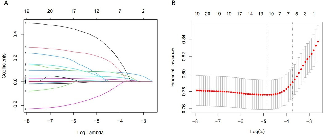 Figure 3. Features selection by LASSO. (A) LASSO coefficients profiles (y-axis) of the 20 features. The upper x-axis is the average numbers of predictors and the lower x-axis is the log (λ). (B) Ten-fold cross-validation for tuning parameter selection in the LASSO model.
